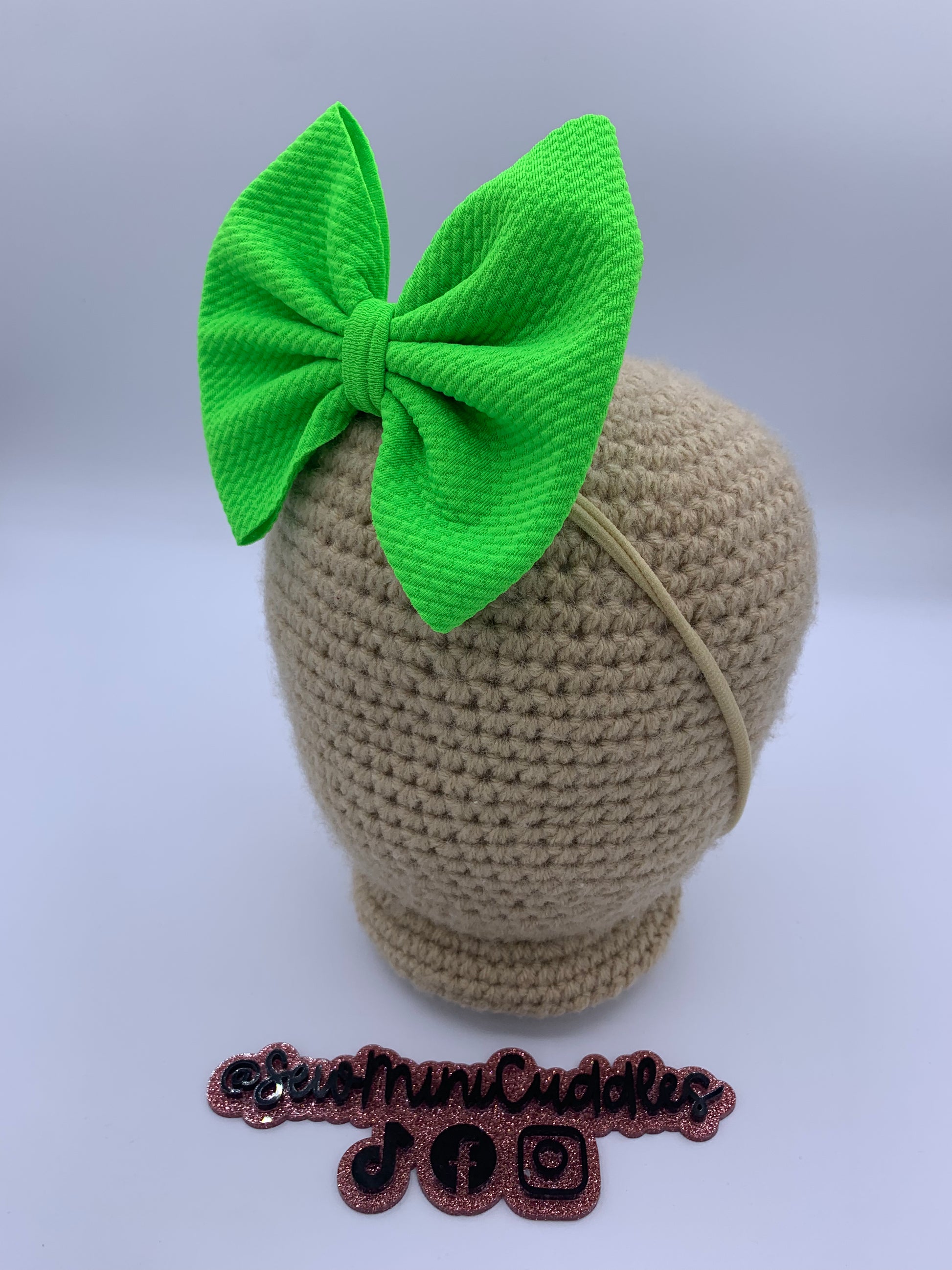 These bows are approximately 5 inches wide. You have the choice of the bow being on a 2.25 inch alligator clip or a stretchy nylon band . The nylon band is a one size fits all.