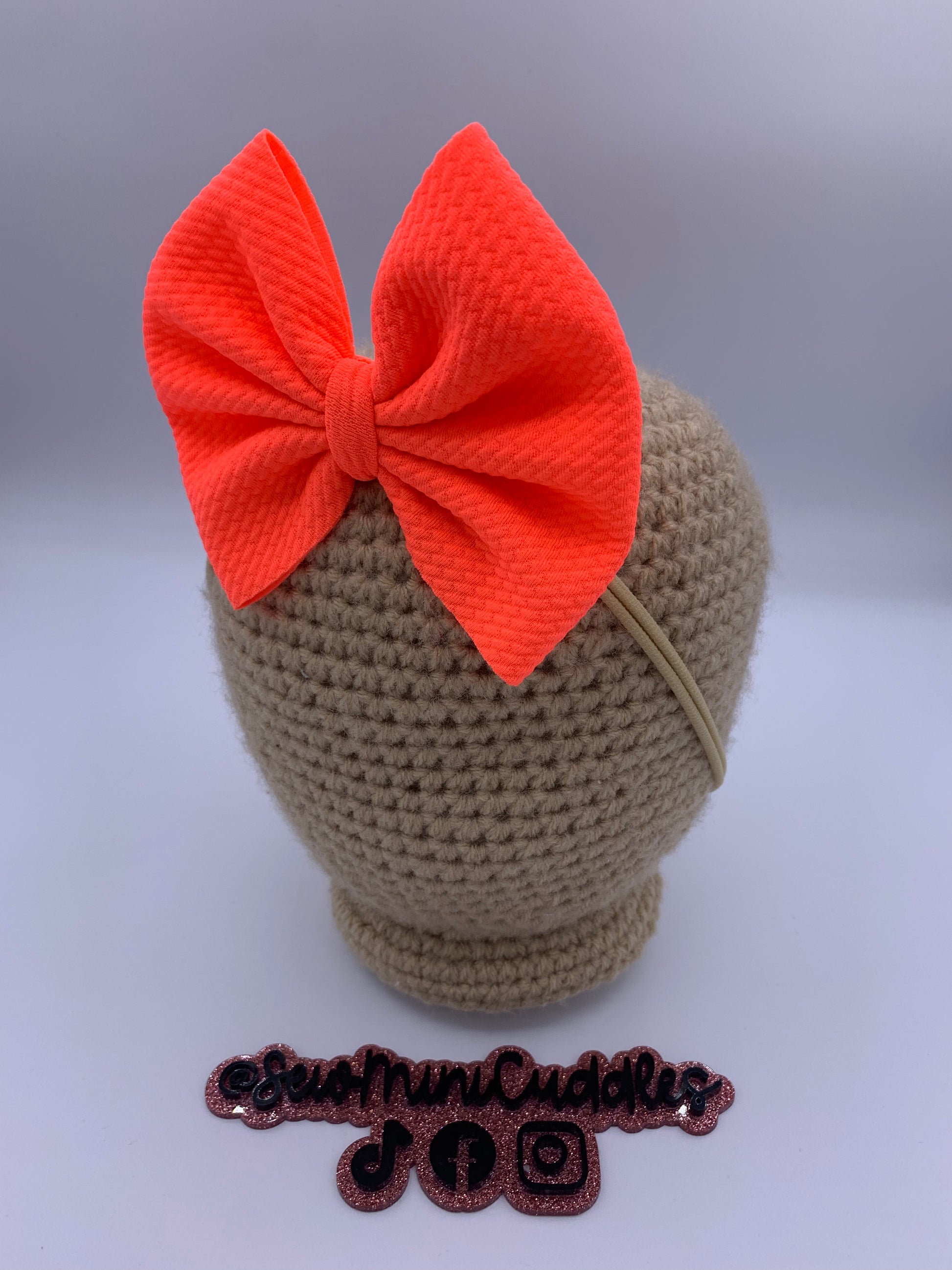 These bows are approximately 5 inches wide. You have the choice of the bow being on a 2.25 inch alligator clip or a stretchy nylon band . The nylon band is a one size fits all.
