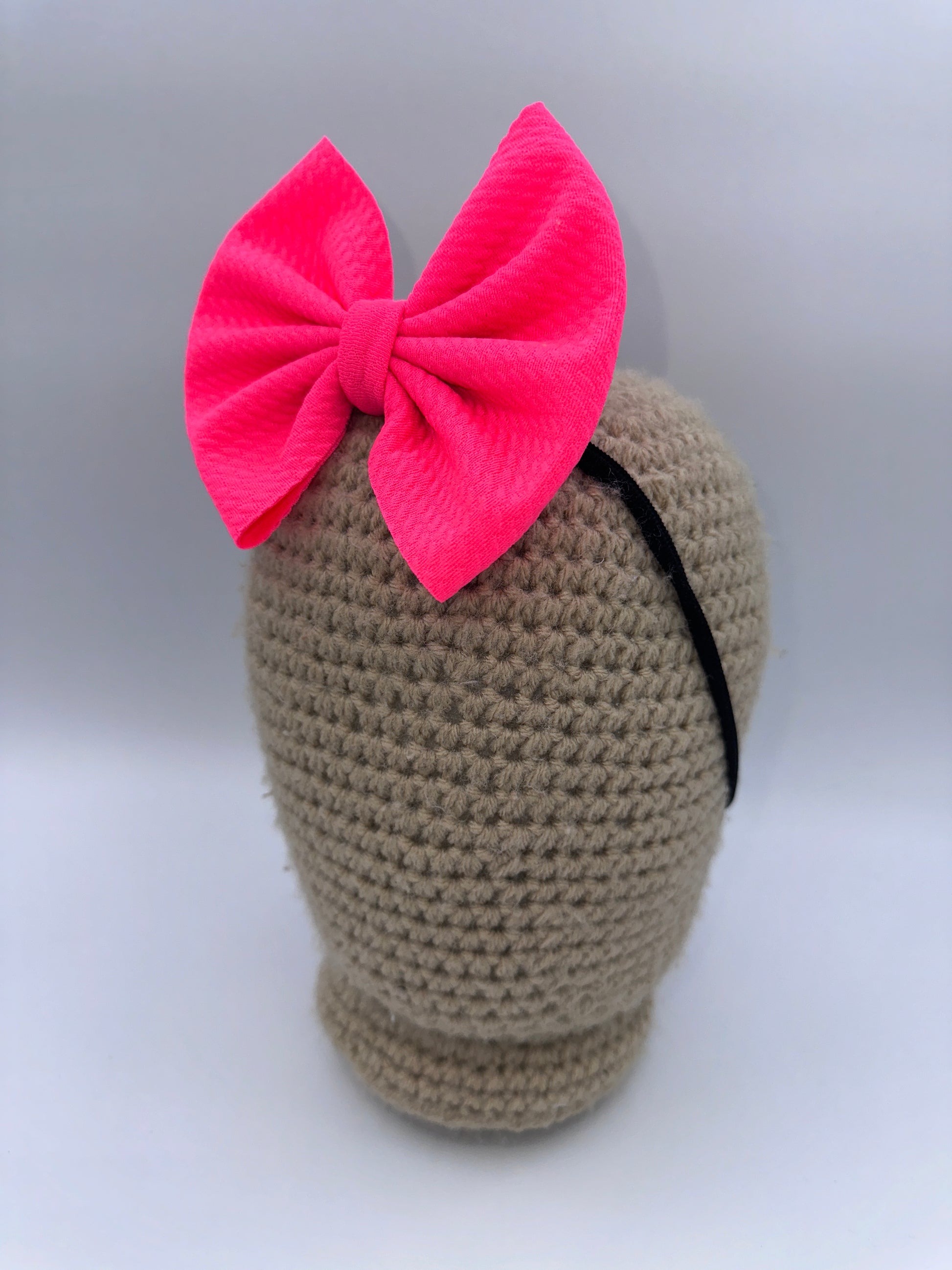 These bows are approximately 5 inches wide. You have the choice of the bow being on a 2.25 inch alligator clip or a stretchy nylon band . The nylon band is a one size fits all.