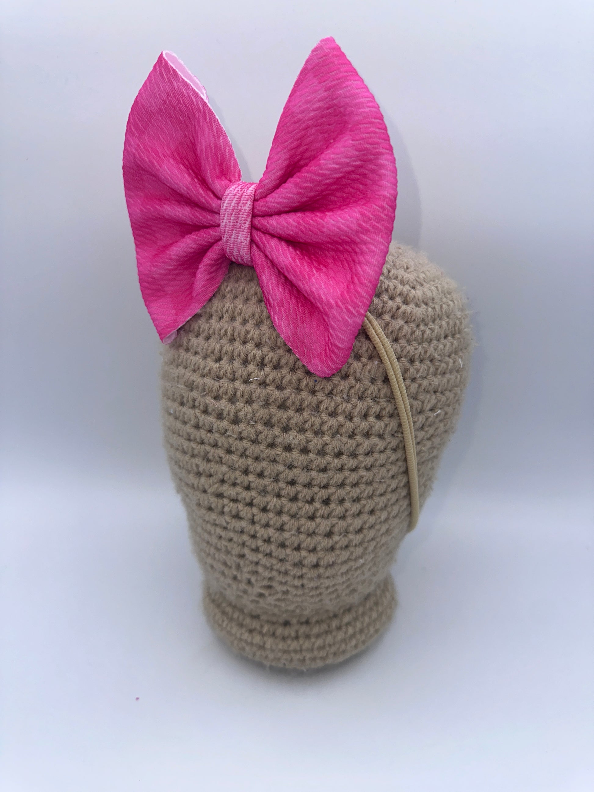 These bows are approximately 5 inches wide. You have the choice of the bow being on a 2.25 inch alligator clip or a stretchy nylon band . The nylon band is a one size fits all.