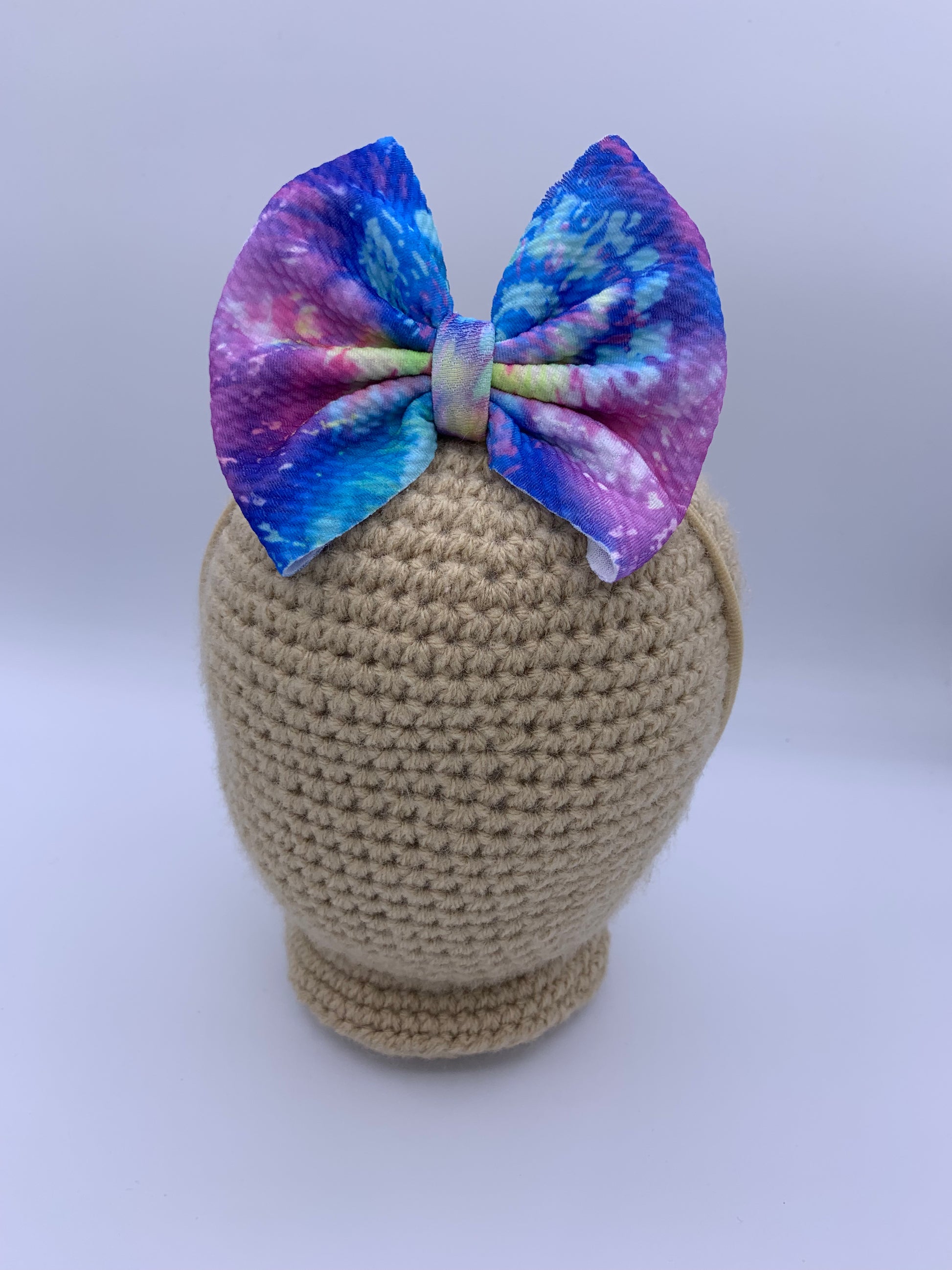 These bows are approximately 5 inches wide. You have the choice of the bow being on a 2.25 inch alligator clip or a stretchy nylon band . The nylon band is a one size fits all.