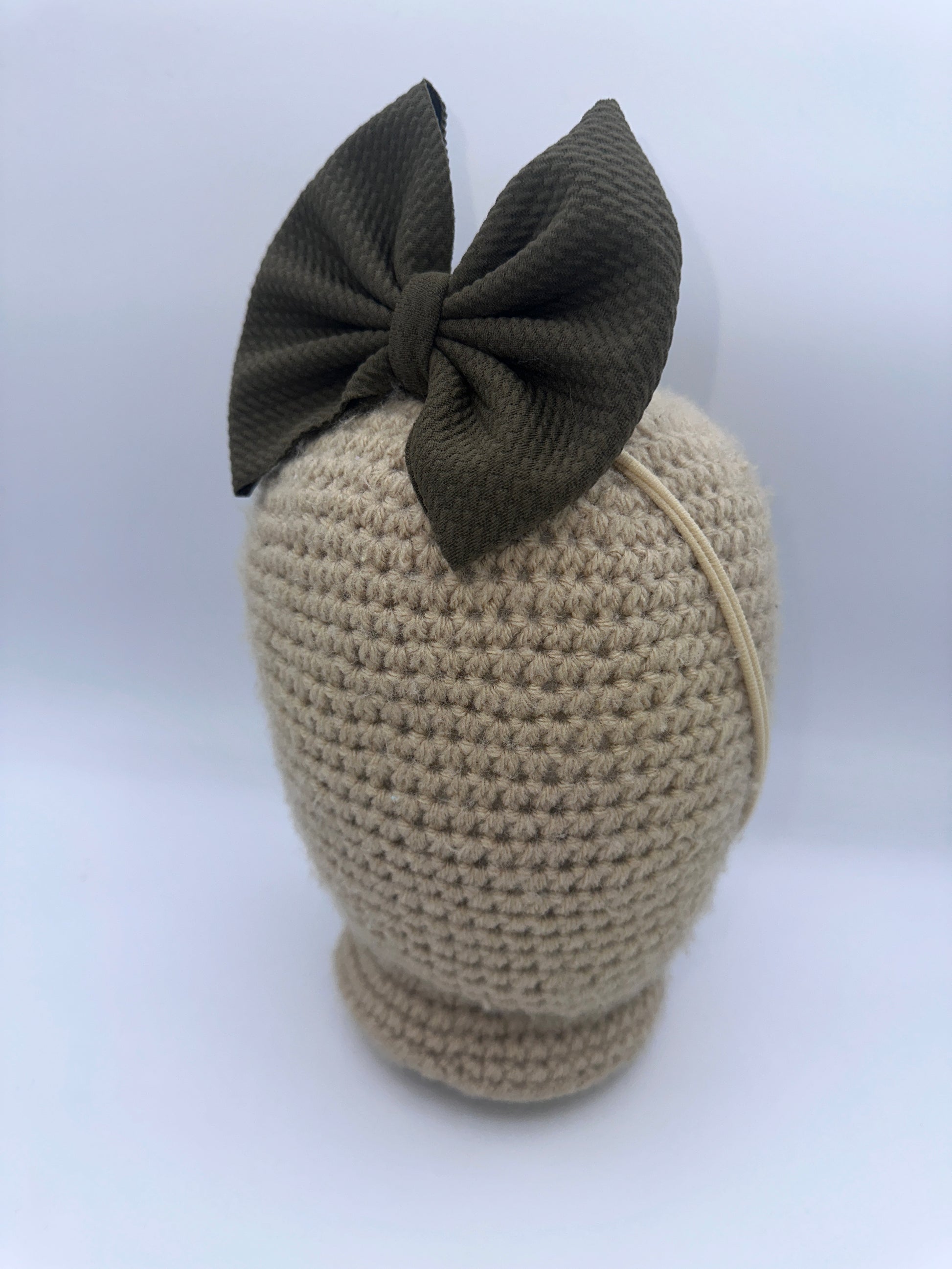 These bows are approximately 5 inches wide. You have the choice of the bow being on a 2.25 inch alligator clip or a stretchy nylon band . The nylon band is a one size fits all.