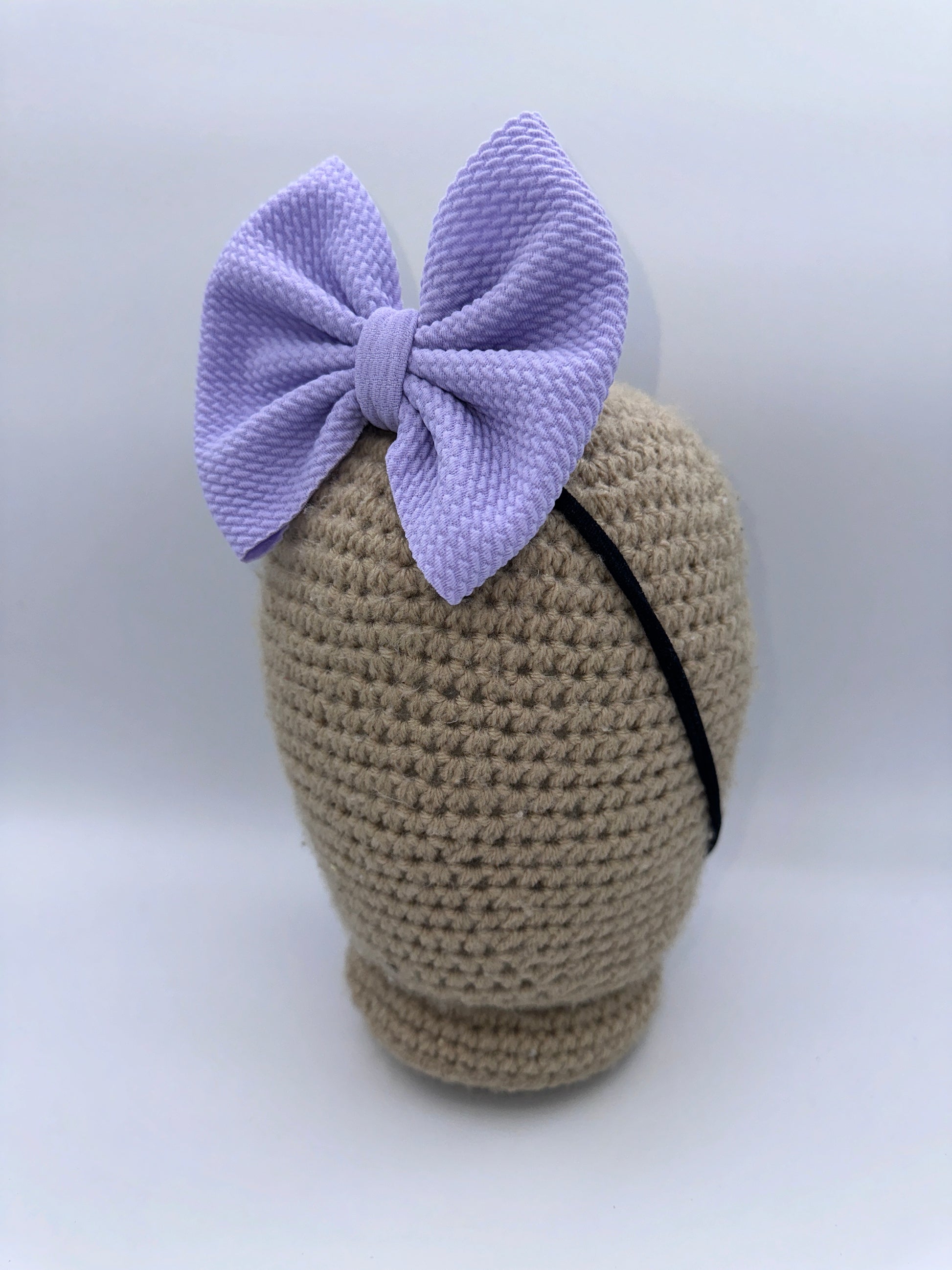 These bows are approximately 5 inches wide. You have the choice of the bow being on a 2.25 inch alligator clip or a stretchy nylon band . The nylon band is a one size fits all.