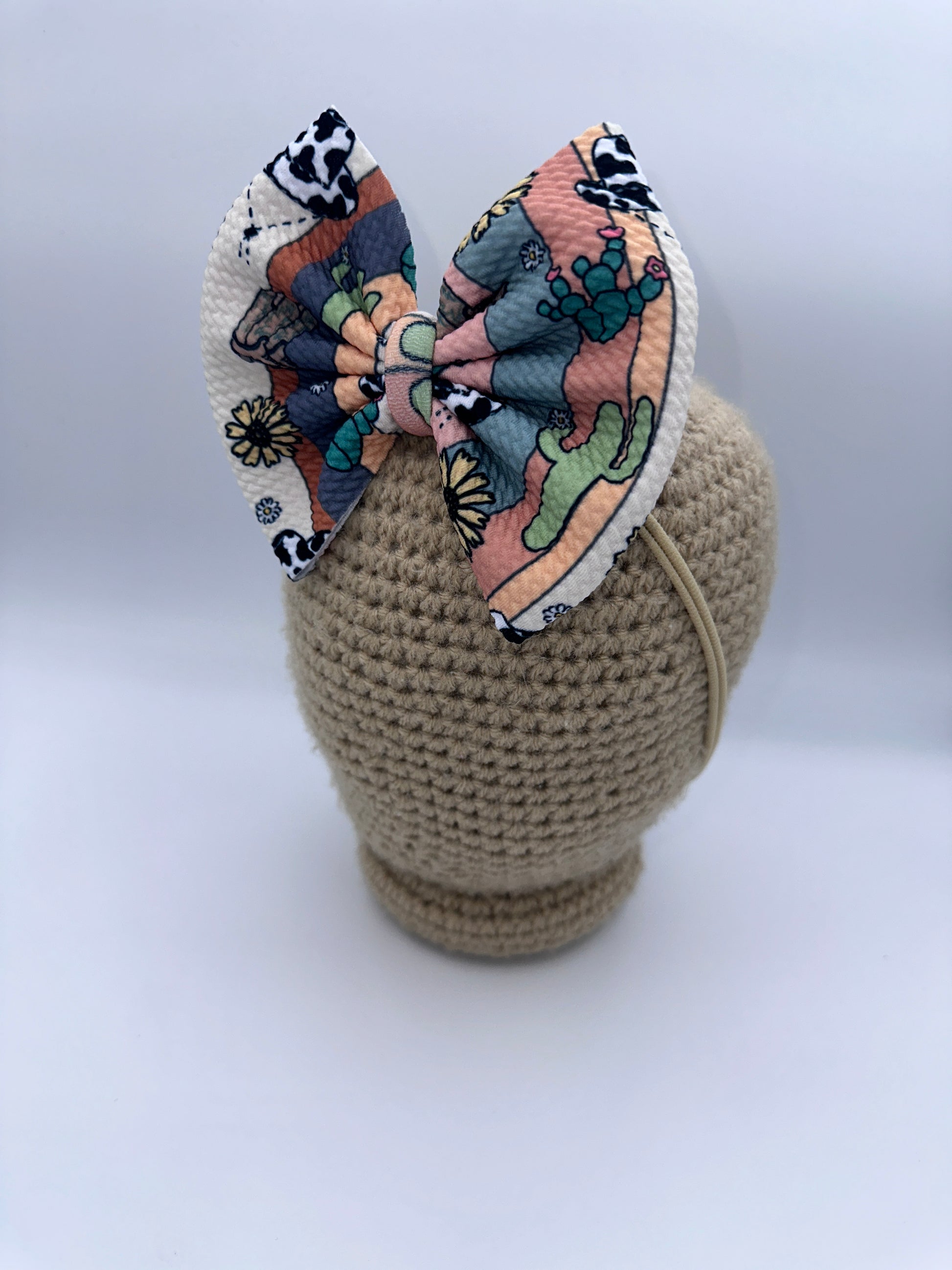 These bows are approximately 5 inches wide. You have the choice of the bow being on a 2.25 inch alligator clip or a stretchy nylon band . The nylon band is a one size fits all.