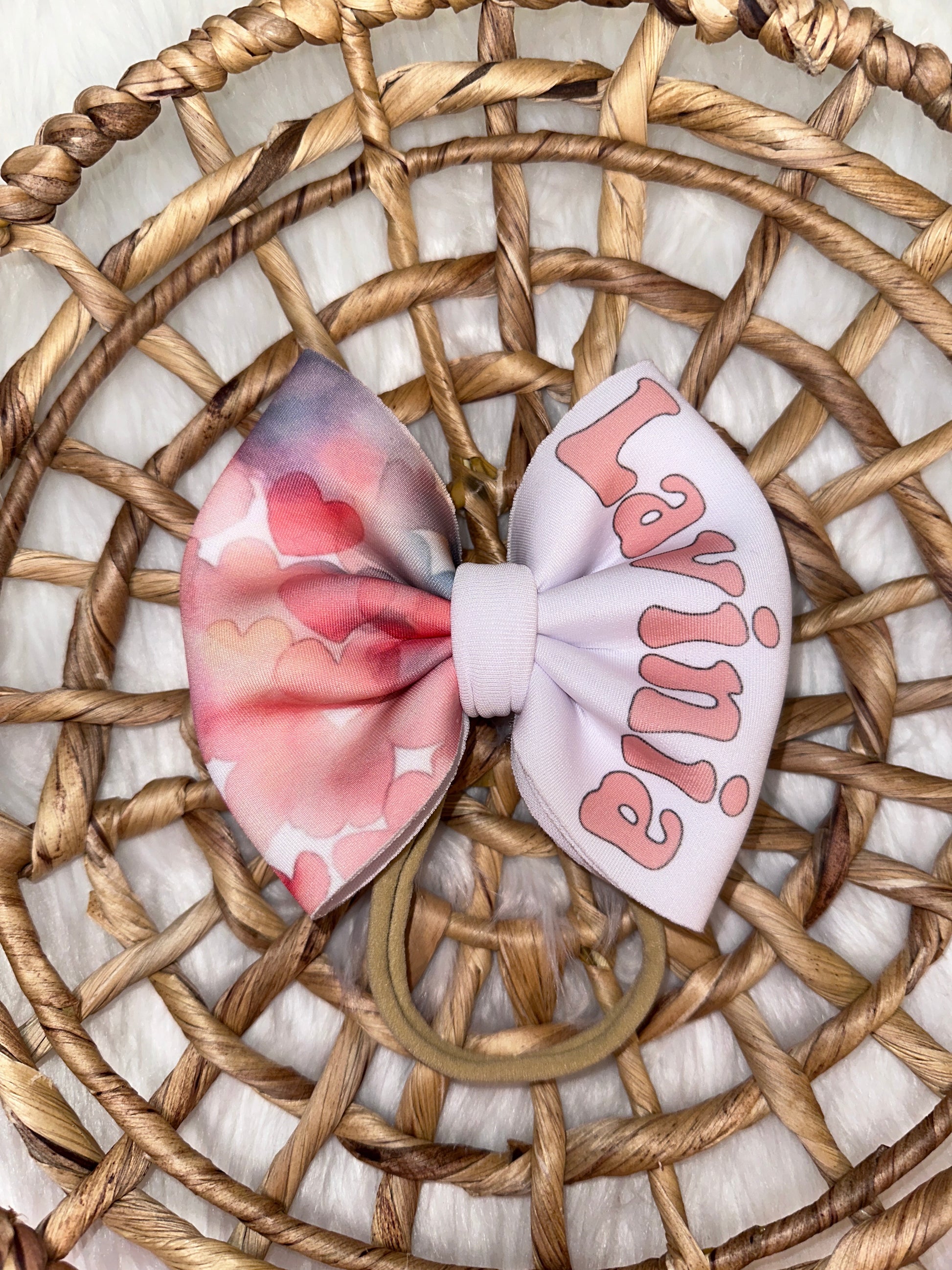 These bows are approximately 5 inches wide. You have the choice of the bow being on a 2.25 inch alligator clip or a stretchy nylon band . The nylon band is a one size fits all.