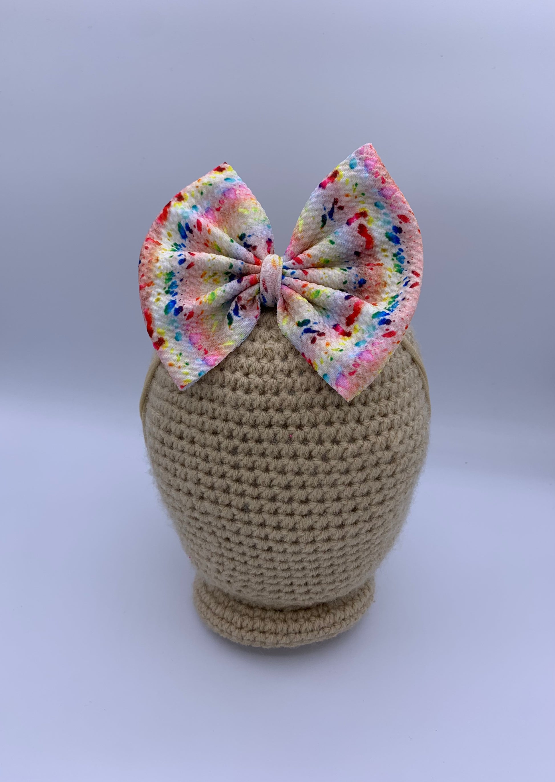 These bows are approximately 5 inches wide. You have the choice of the bow being on a 2.25 inch alligator clip or a stretchy nylon band . The nylon band is a one size fits all.