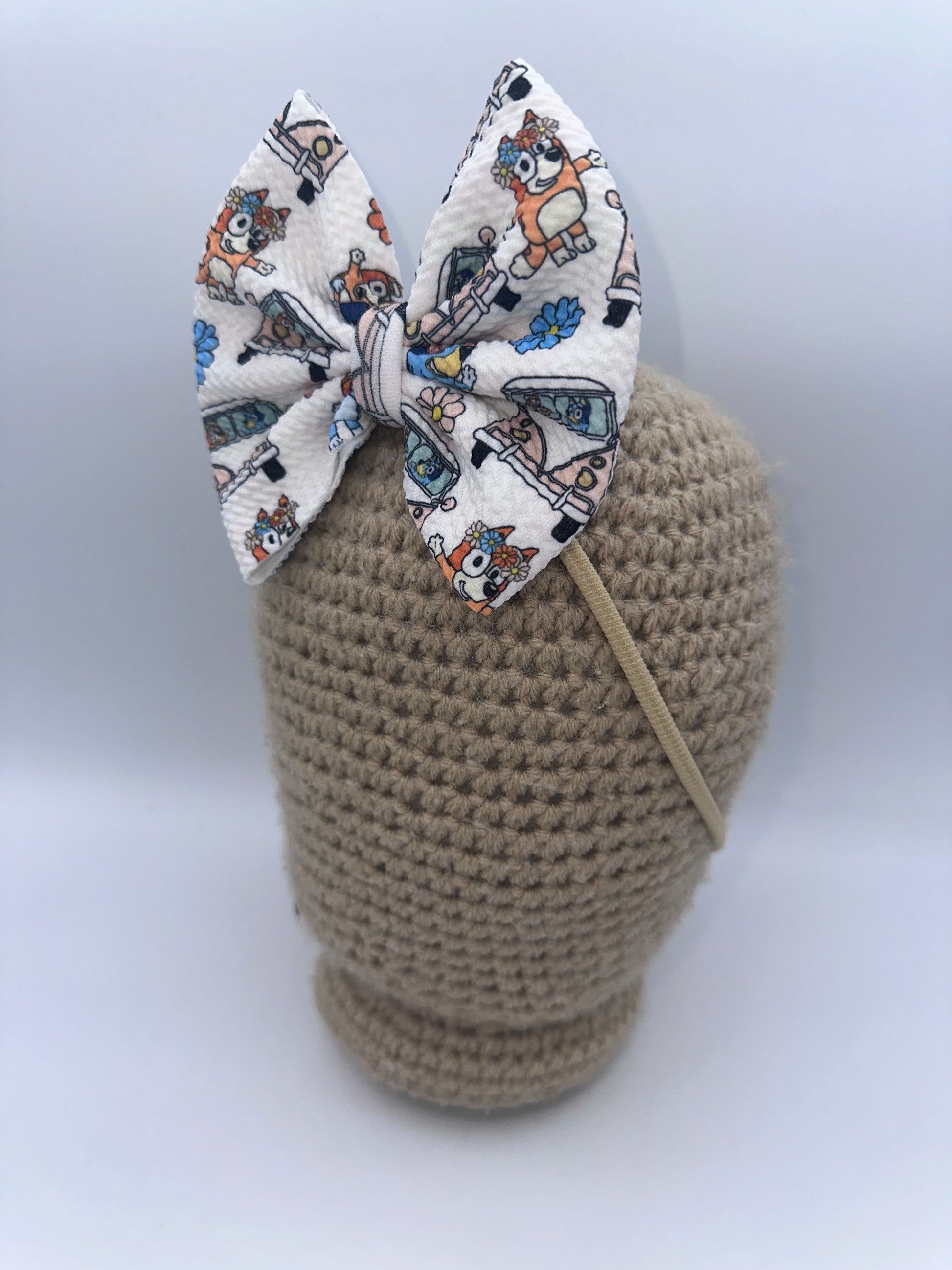 These bows are approximately 5 inches wide. You have the choice of the bow being on a 2.25 inch alligator clip or a stretchy nylon band . The nylon band is a one size fits all.