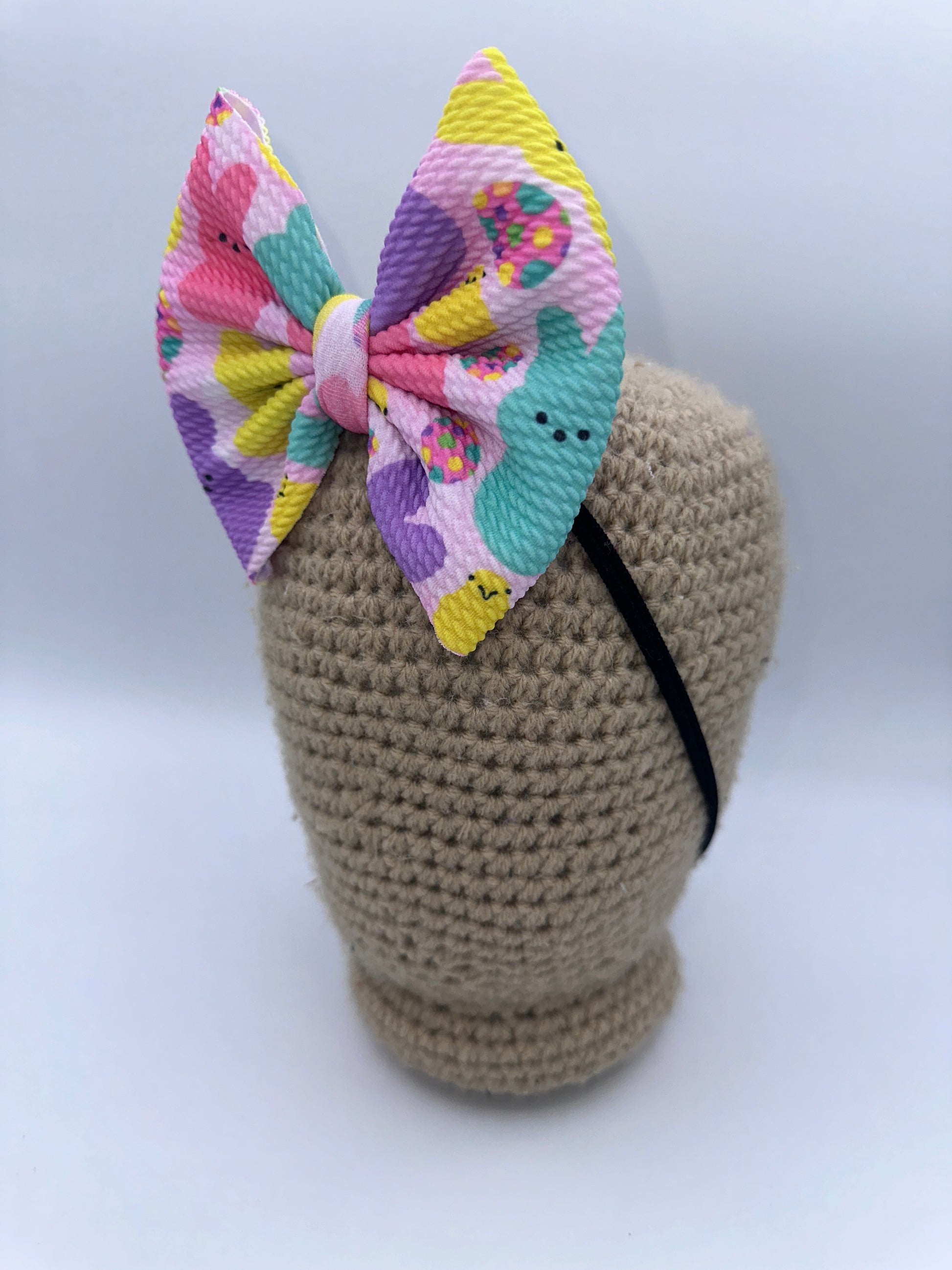 These bows are approximately 5 inches wide. You have the choice of the bow being on a 2.25 inch alligator clip or a stretchy nylon band . The nylon band is a one size fits all.