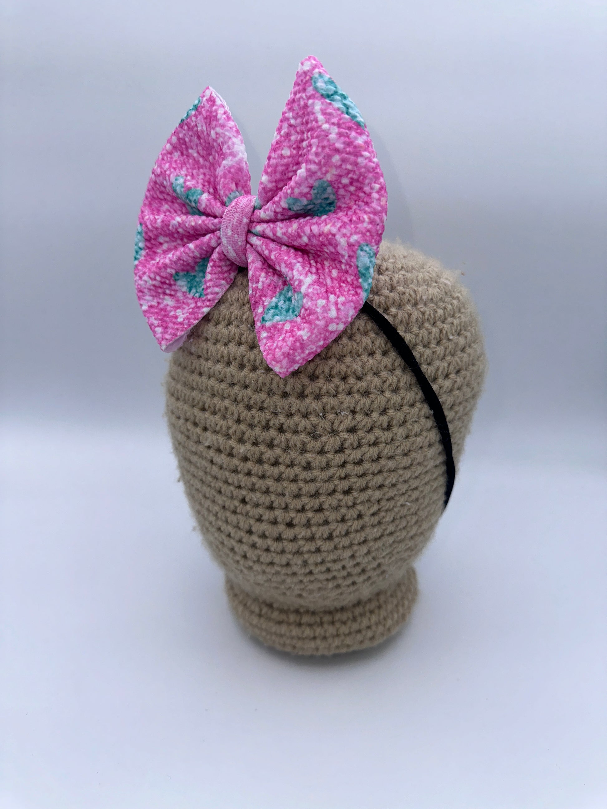 These bows are approximately 5 inches wide. You have the choice of the bow being on a 2.25 inch alligator clip or a stretchy nylon band . The nylon band is a one size fits all.