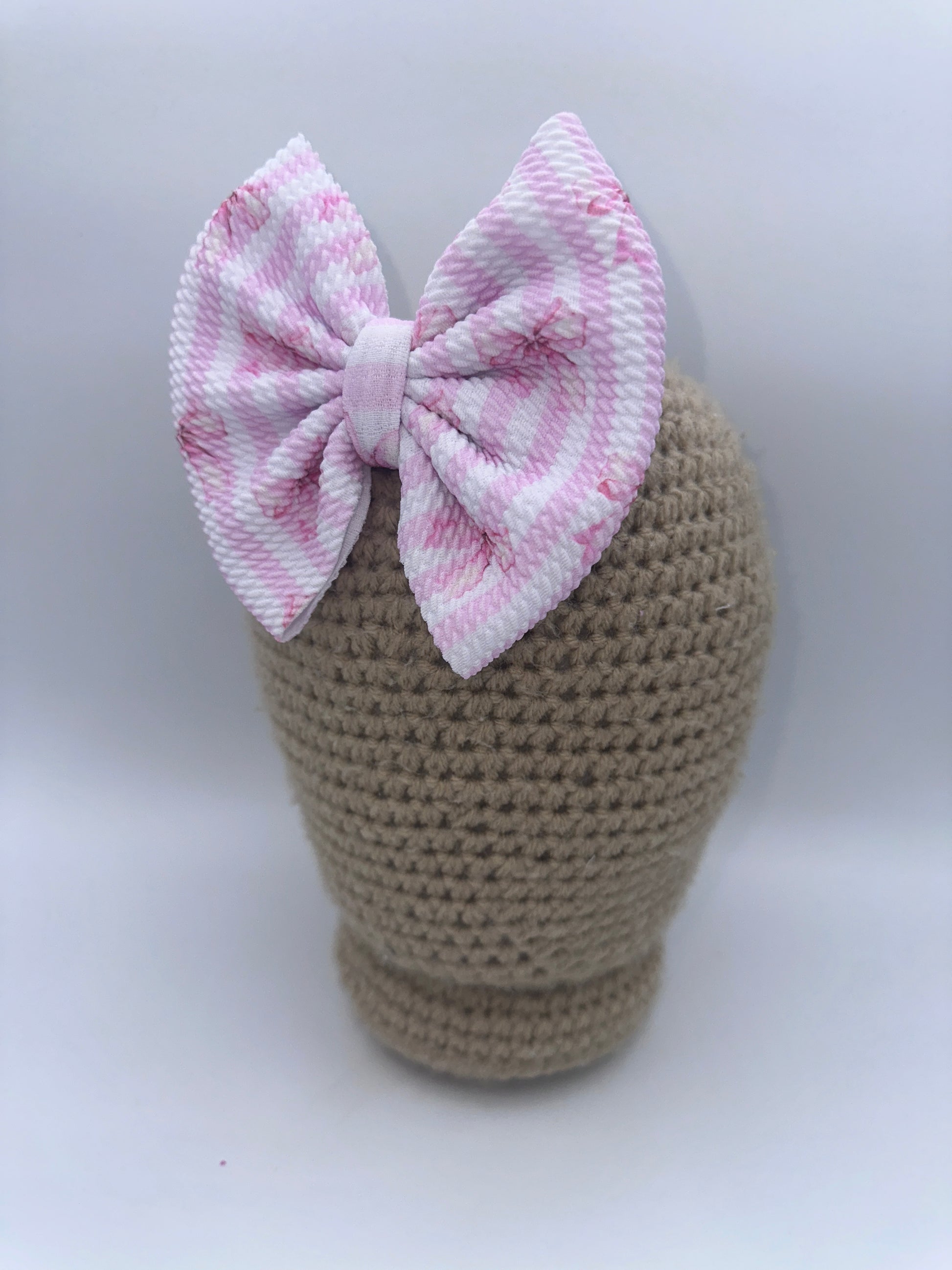 These bows are approximately 5 inches wide. You have the choice of the bow being on a 2.25 inch alligator clip or a stretchy nylon band . The nylon band is a one size fits all.