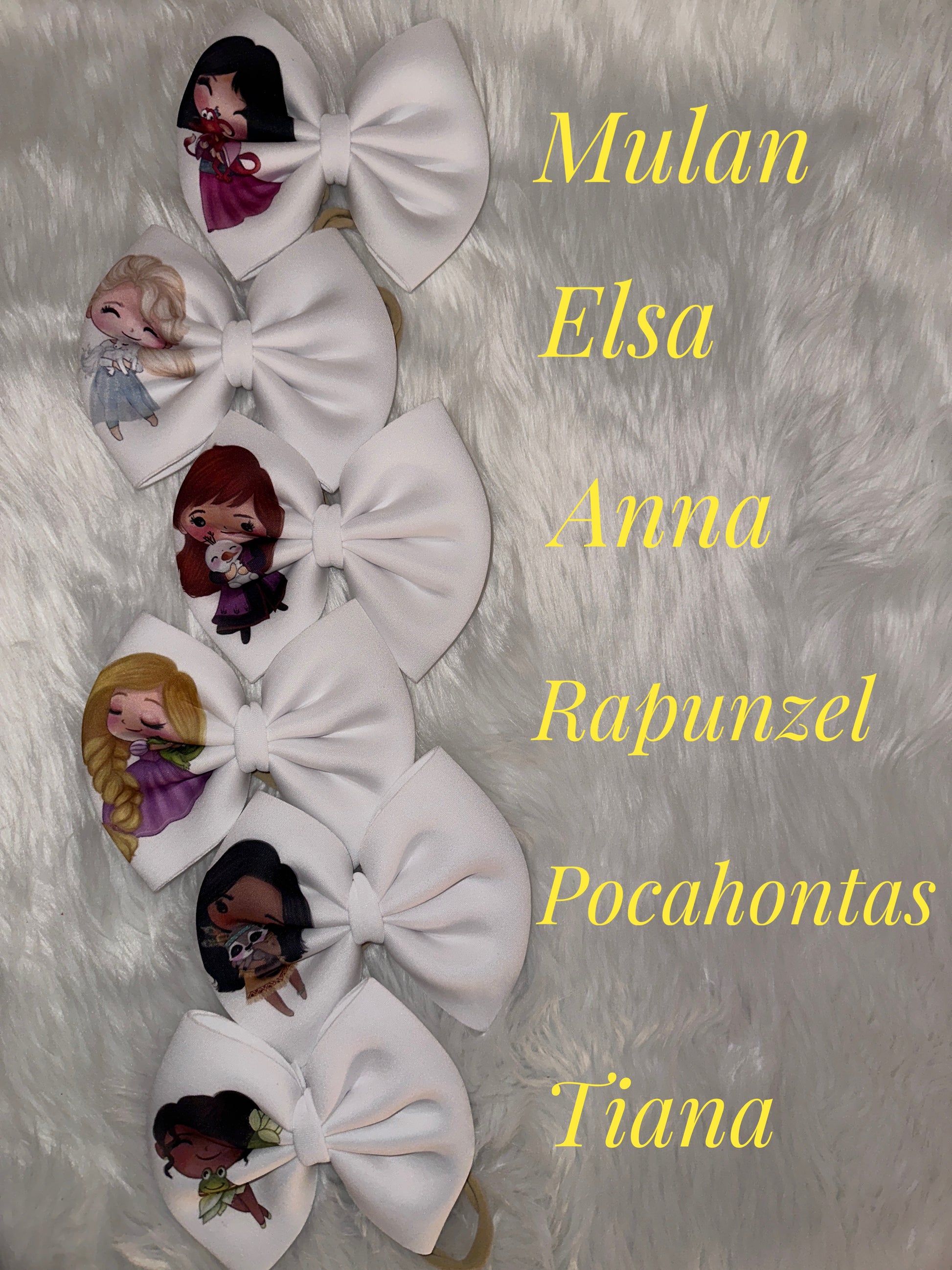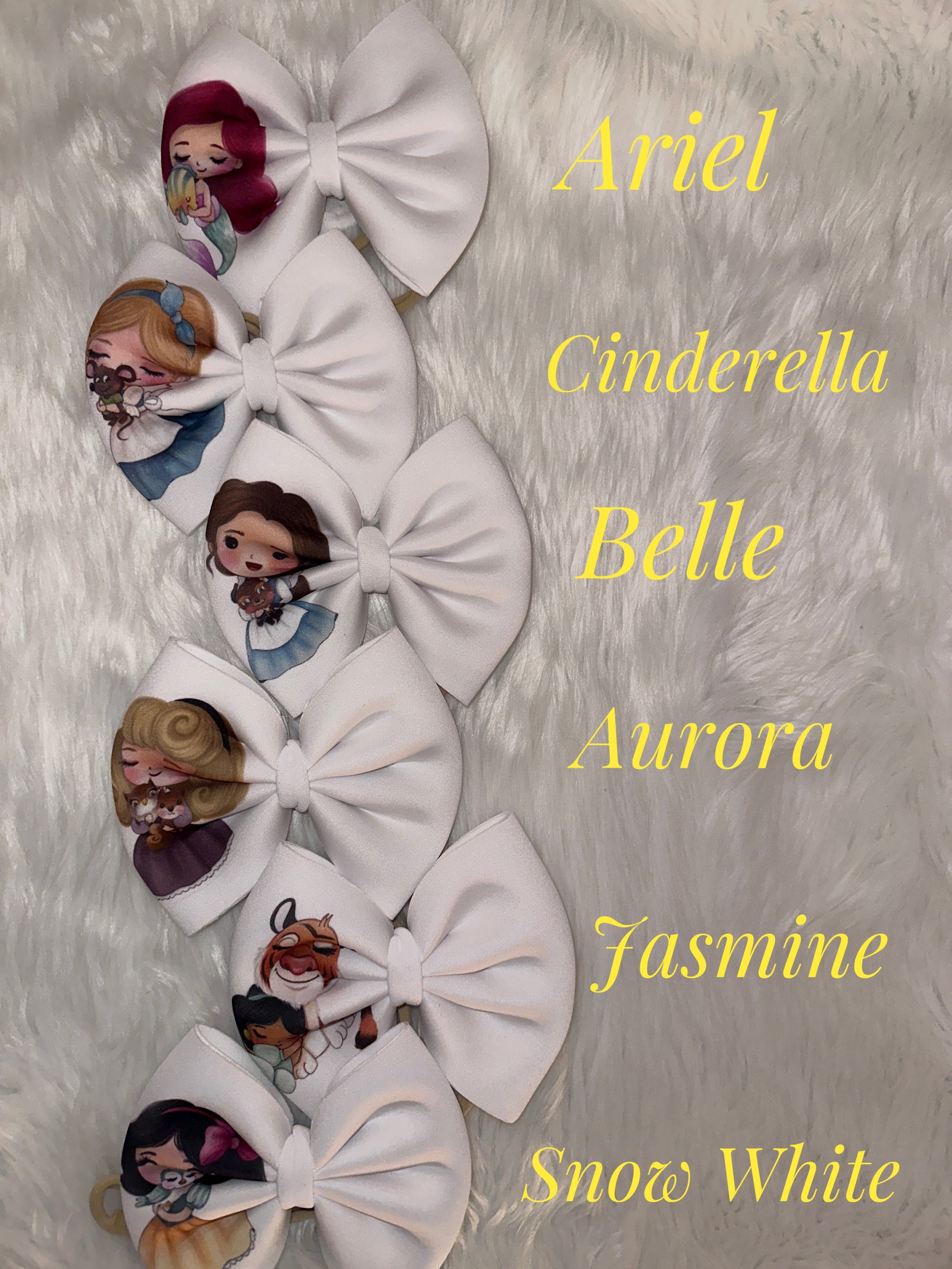 These bows are approximately 5 inches wide. You have the choice of the bow being on a 2.25 inch alligator clip or a stretchy nylon band . The nylon band is a one size fits all.