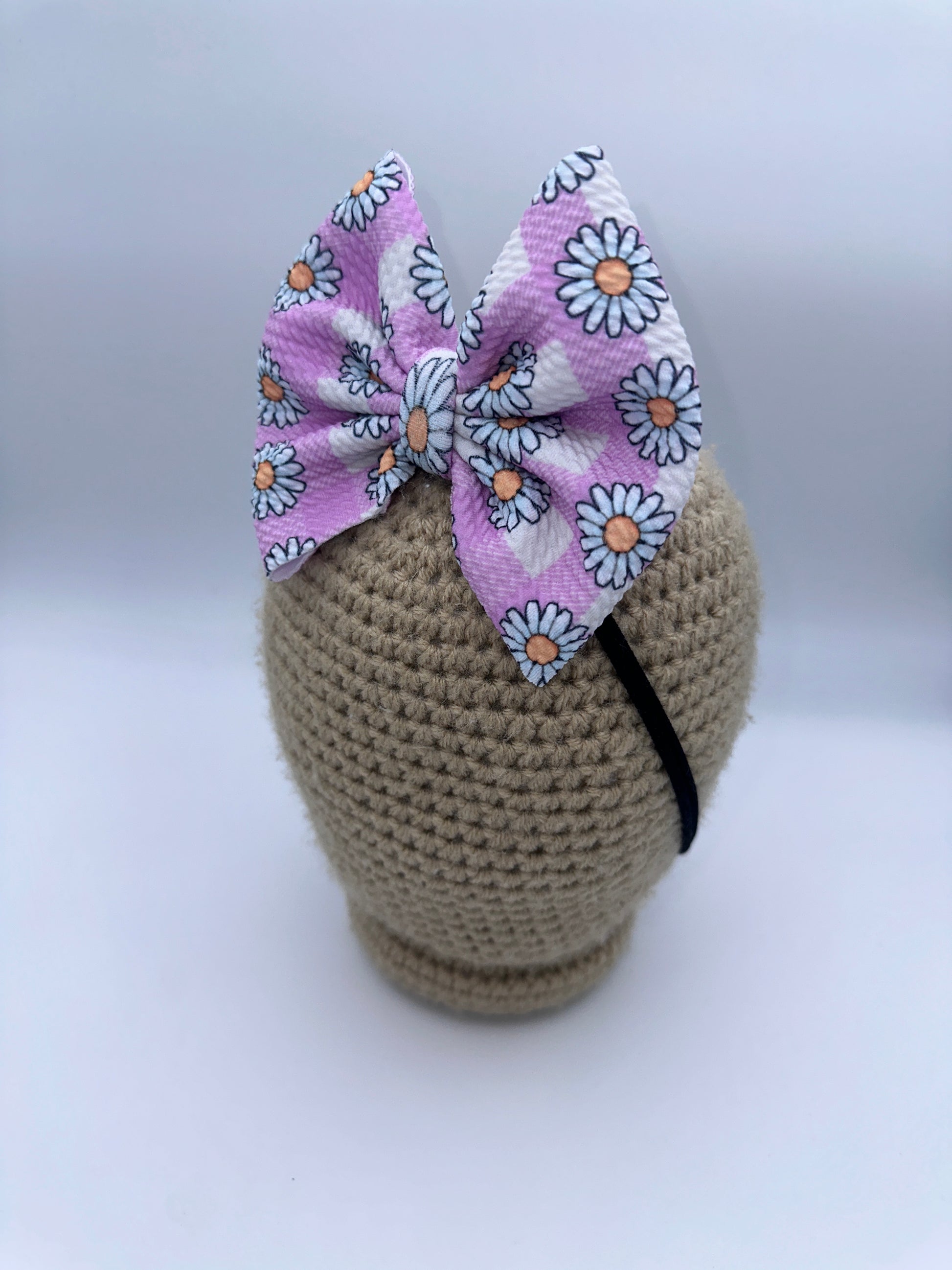 These bows are approximately 5 inches wide. You have the choice of the bow being on a 2.25 inch alligator clip or a stretchy nylon band . The nylon band is a one size fits all.