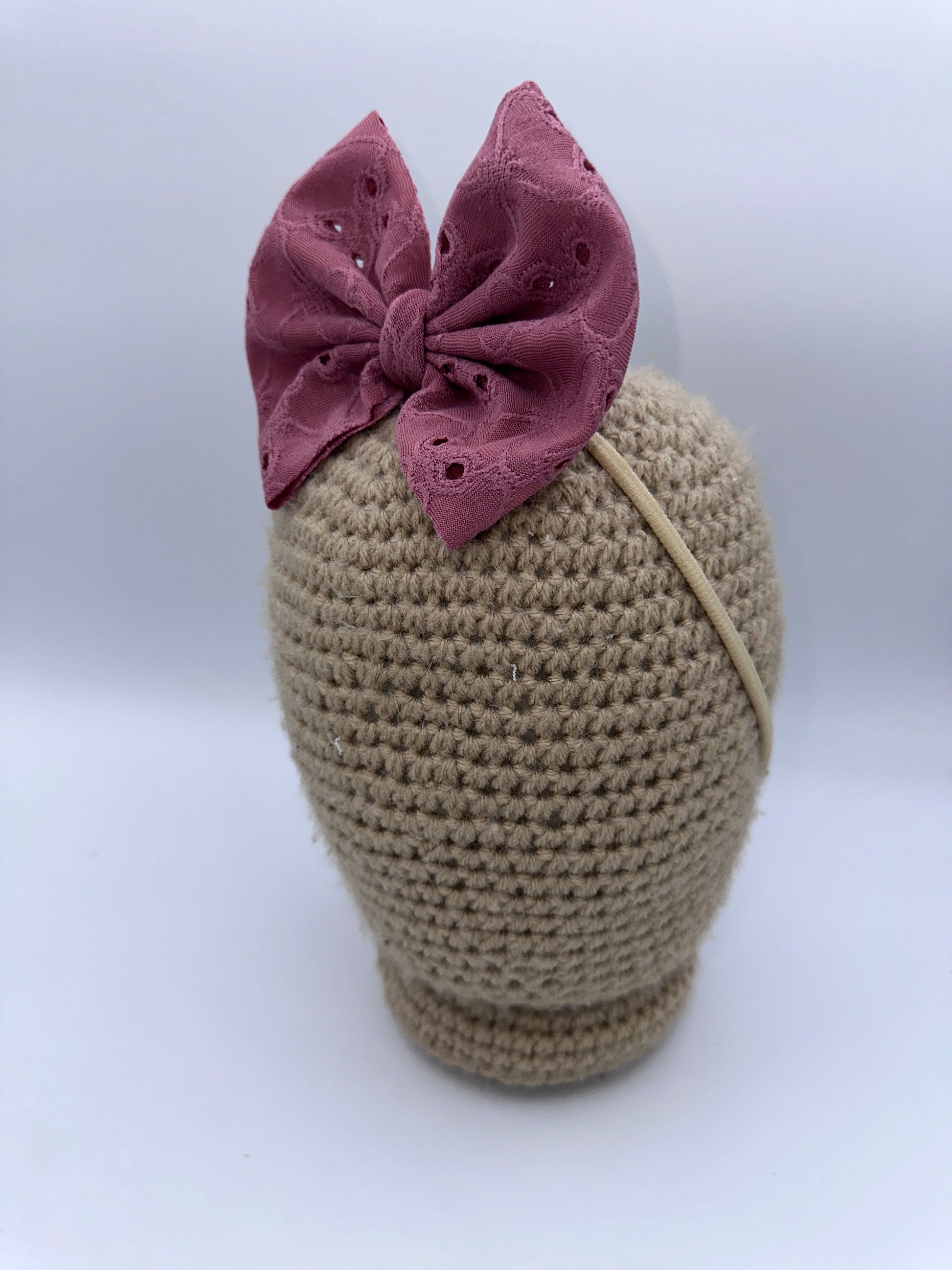 These bows are approximately 5 inches wide. You have the choice of the bow being on a 2.25 inch alligator clip or a stretchy nylon band . The nylon band is a one size fits all.
