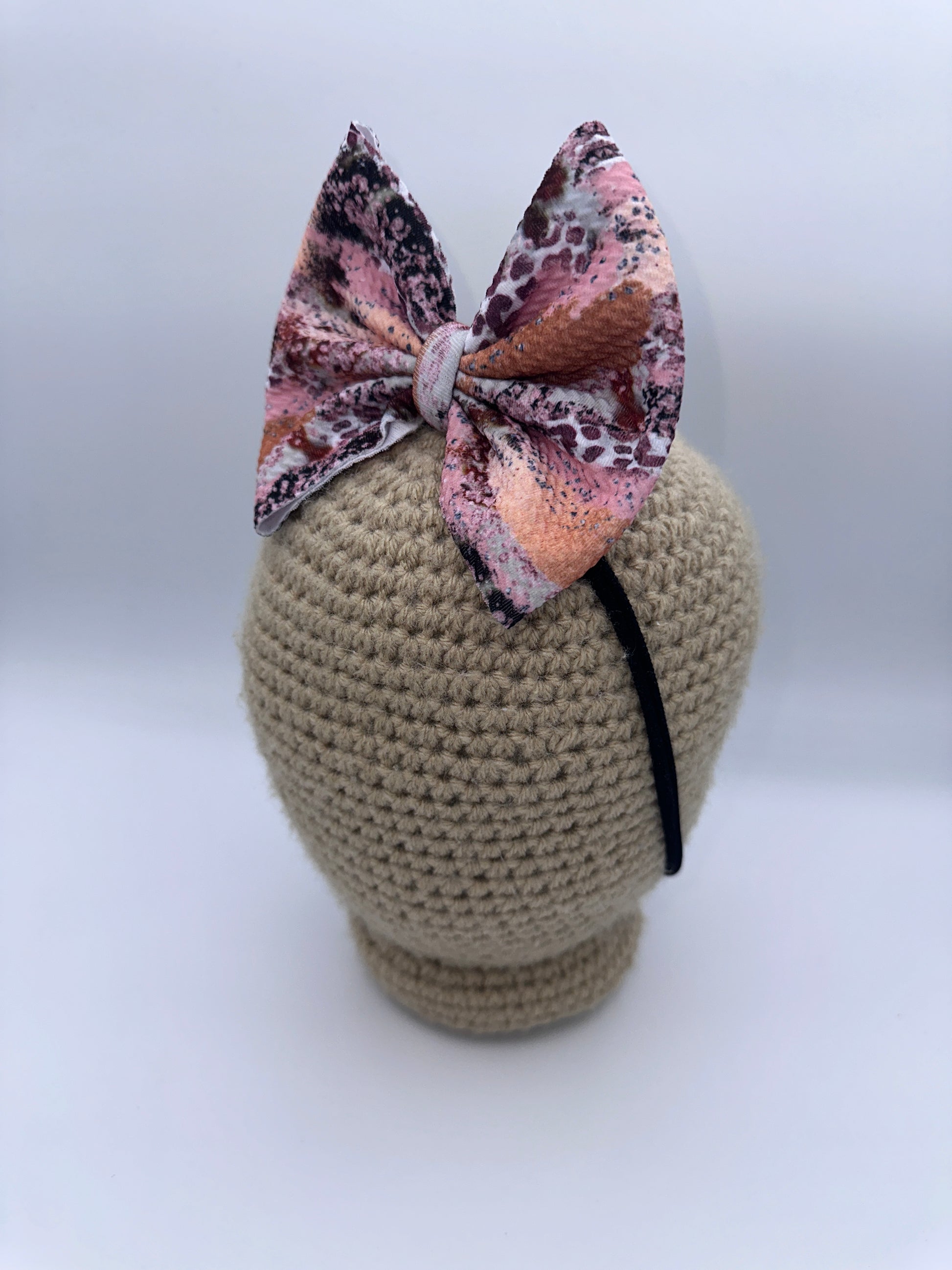 These bows are approximately 5 inches wide. You have the choice of the bow being on a 2.25 inch alligator clip or a stretchy nylon band . The nylon band is a one size fits all.