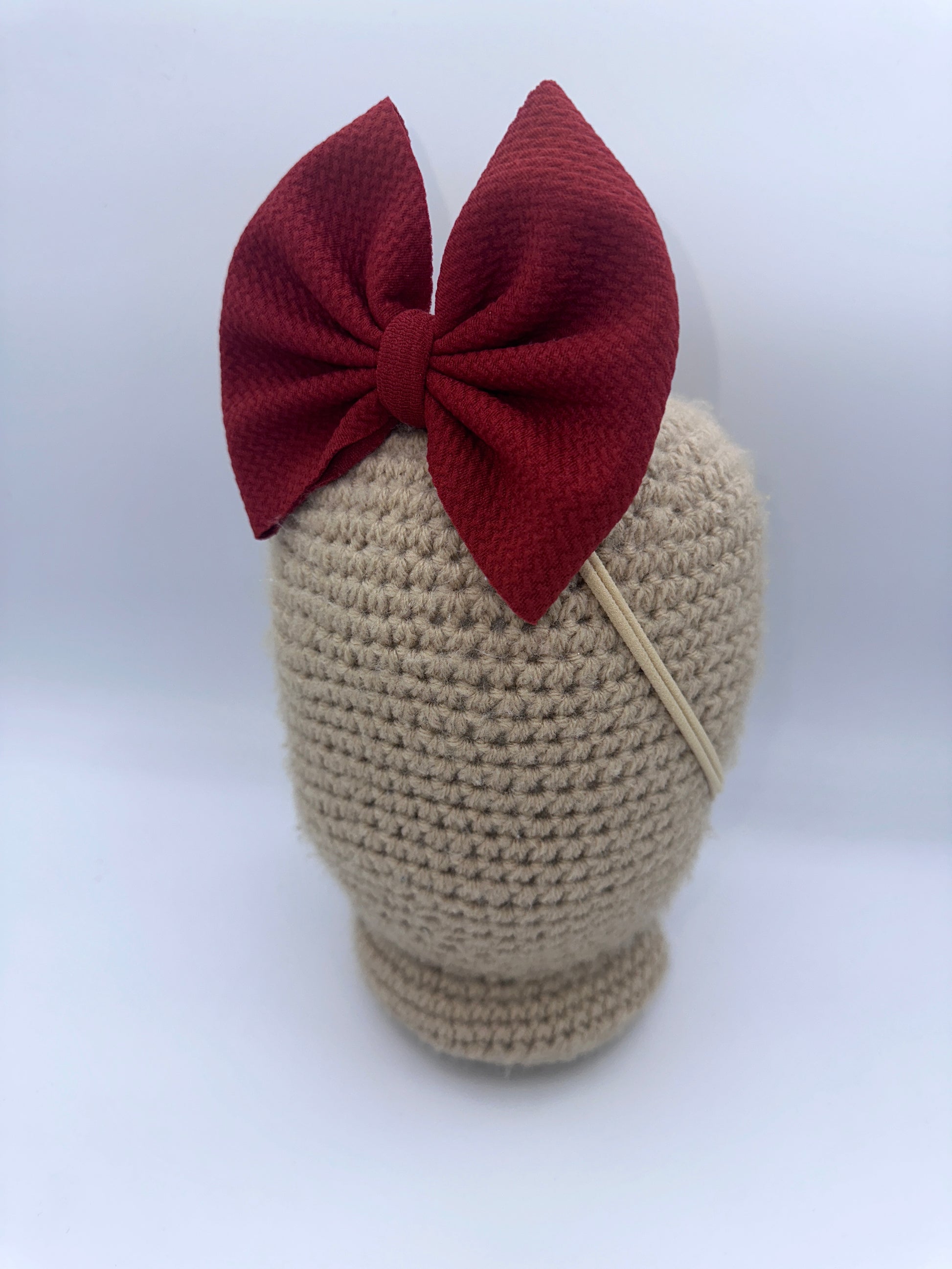 These bows are approximately 5 inches wide. You have the choice of the bow being on a 2.25 inch alligator clip or a stretchy nylon band . The nylon band is a one size fits all.