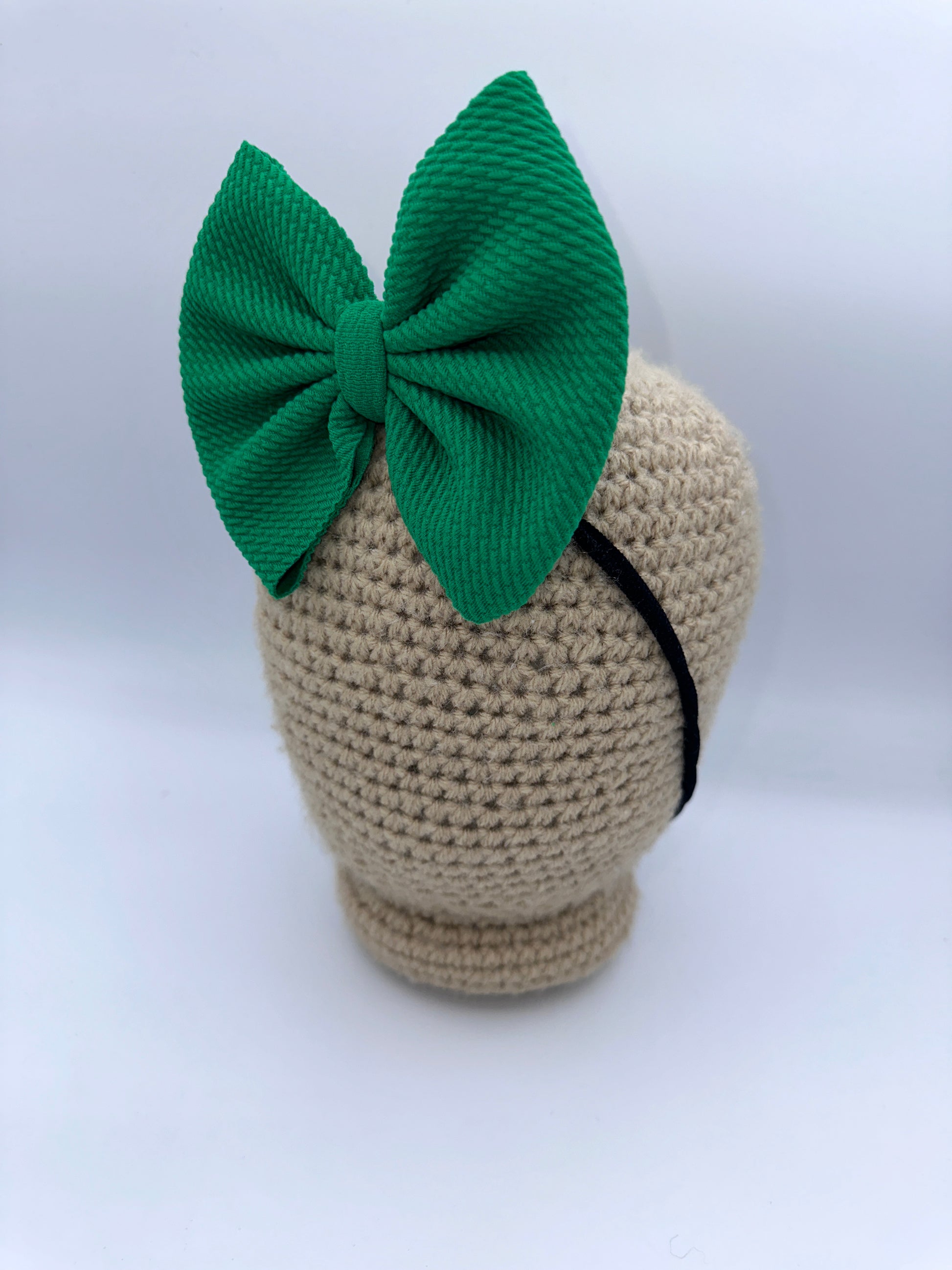 These bows are approximately 5 inches wide. You have the choice of the bow being on a 2.25 inch alligator clip or a stretchy nylon band . The nylon band is a one size fits all.