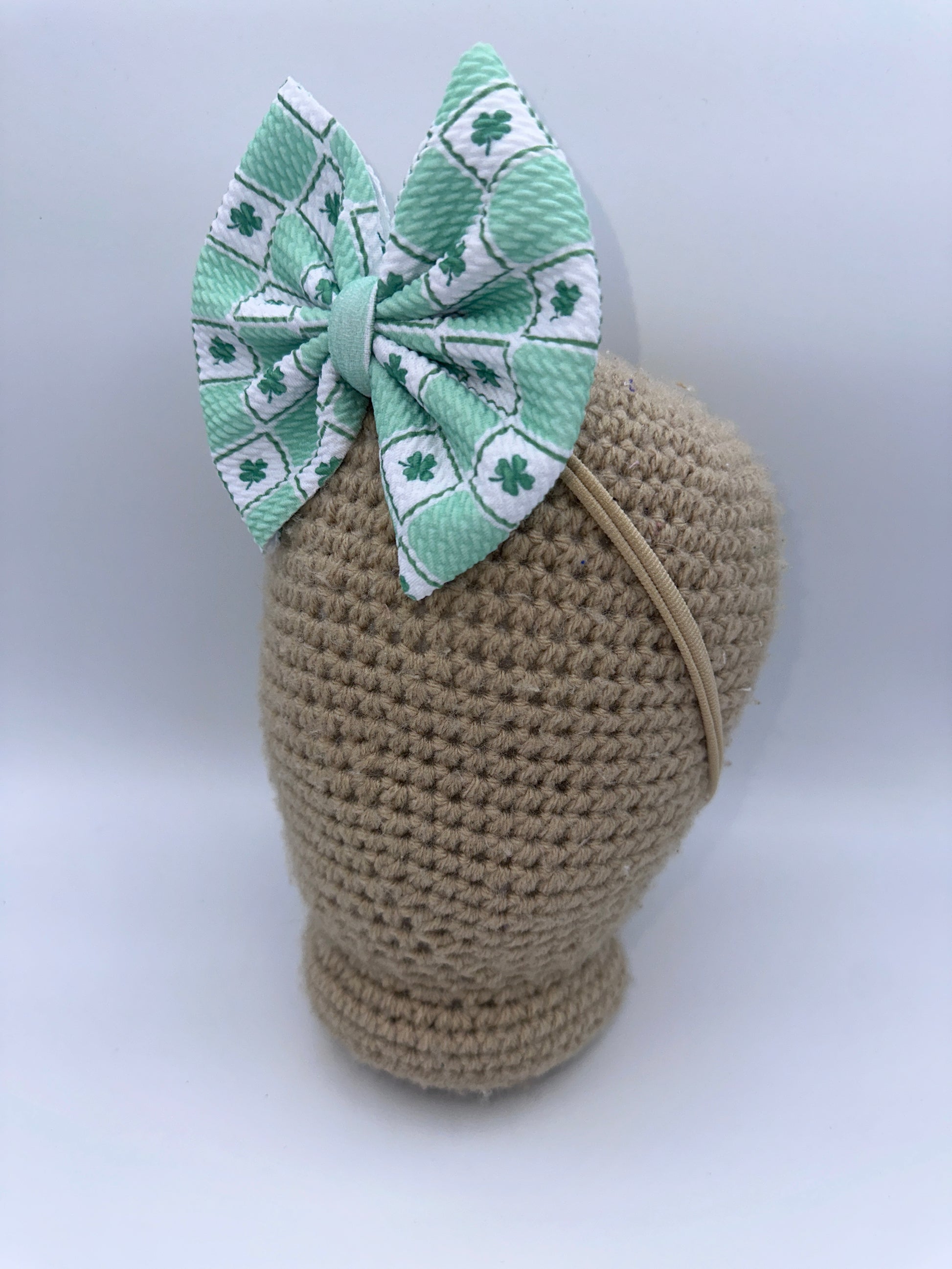 These bows are approximately 5 inches wide. You have the choice of the bow being on a 2.25 inch alligator clip or a stretchy nylon band . The nylon band is a one size fits all.