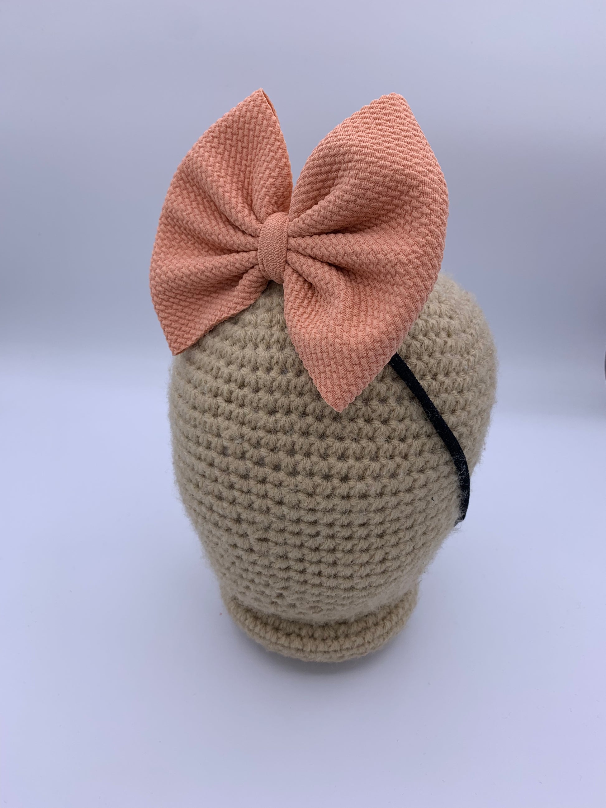 These bows are approximately 5 inches wide. You have the choice of the bow being on a 2.25 inch alligator clip or a stretchy nylon band . The nylon band is a one size fits all.