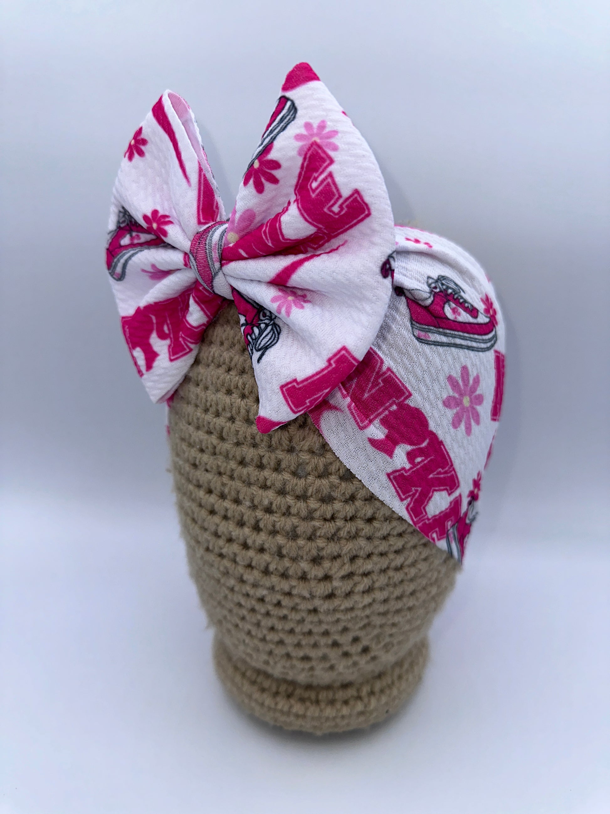 These bows are approximately 5 inches wide and on a 5 inch wide band.