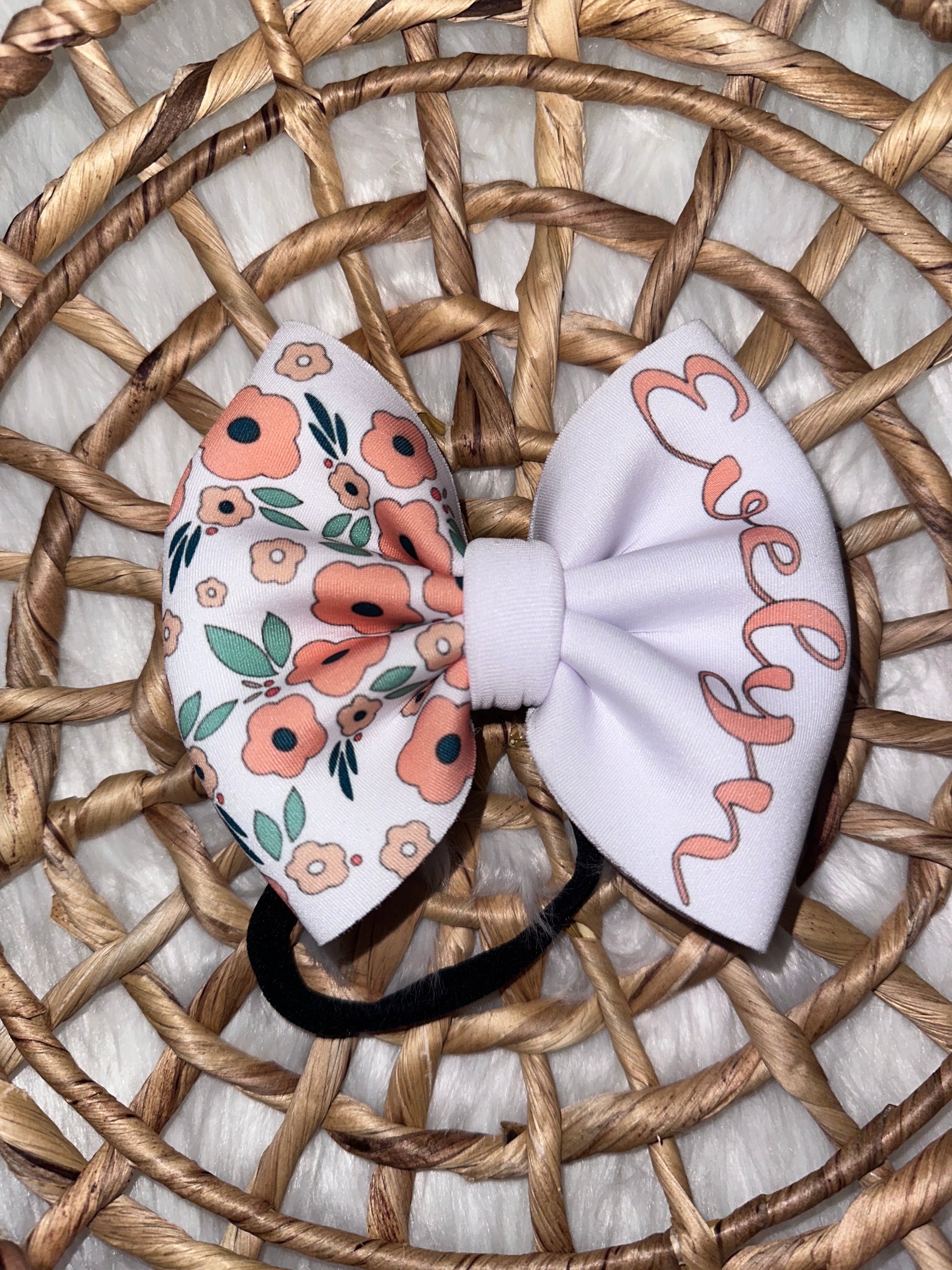 These bows are approximately 5 inches wide. You have the choice of the bow being on a 2.25 inch alligator clip or a stretchy nylon band . The nylon band is a one size fits all.