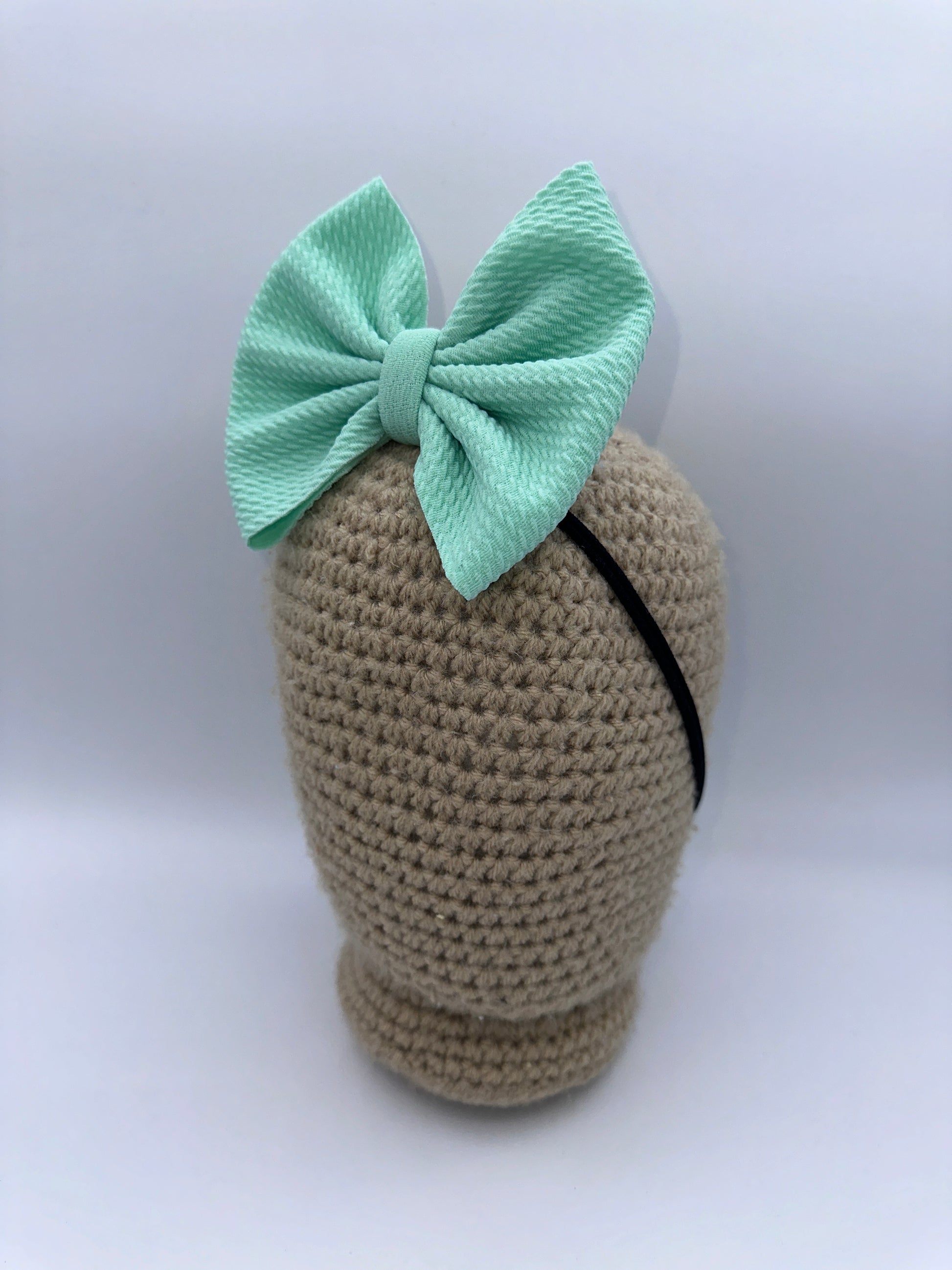 These bows are approximately 5 inches wide. You have the choice of the bow being on a 2.25 inch alligator clip or a stretchy nylon band . The nylon band is a one size fits all.