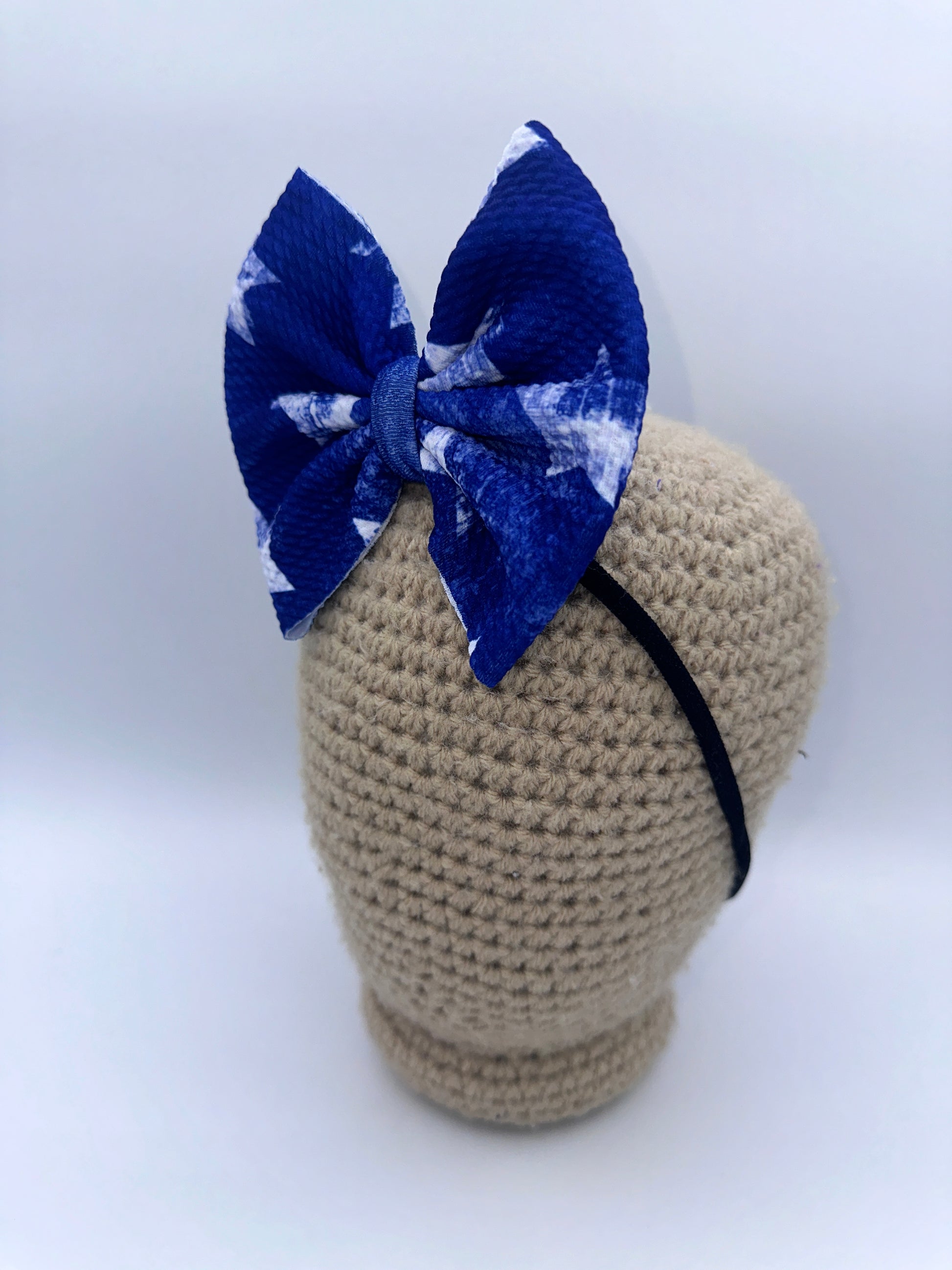 These bows are approximately 5 inches wide. You have the choice of the bow being on a 2.25 inch alligator clip or a stretchy nylon band . The nylon band is a one size fits all.