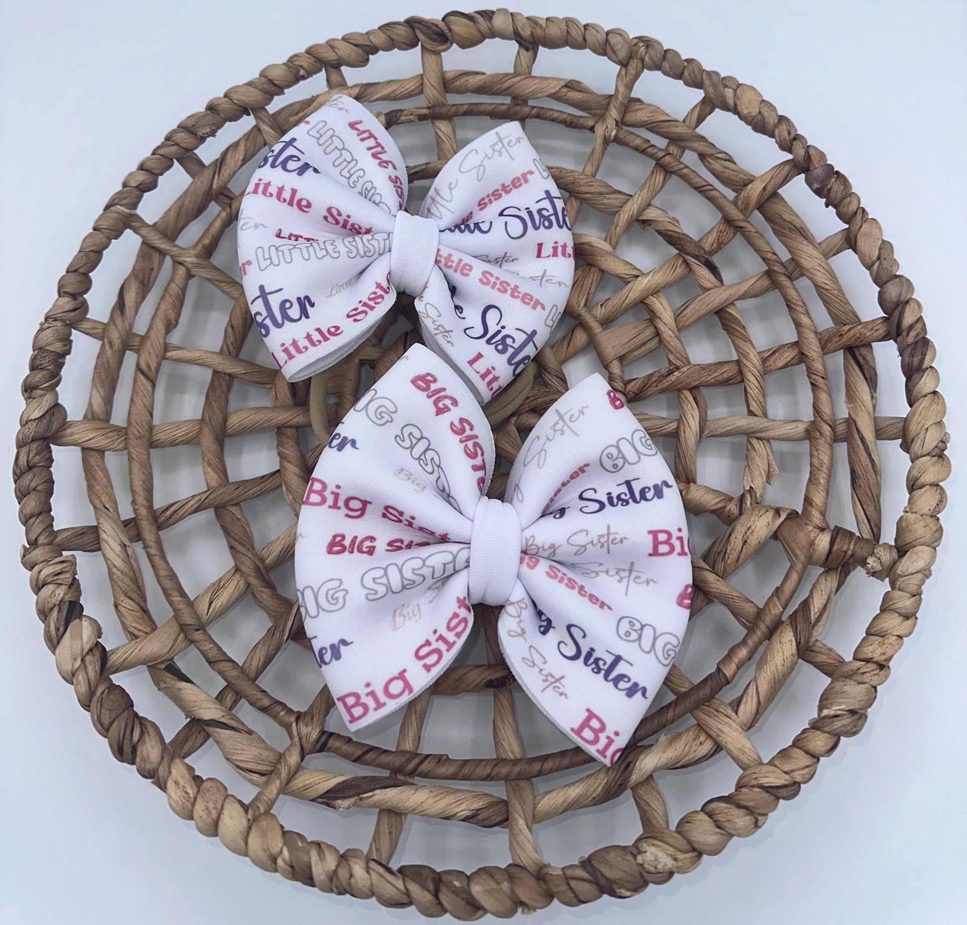 These bows are approximately 5 inches wide. You have the choice of the bow being on a 2.25 inch alligator clip or a stretchy nylon band . The nylon band is a one size fits all.
