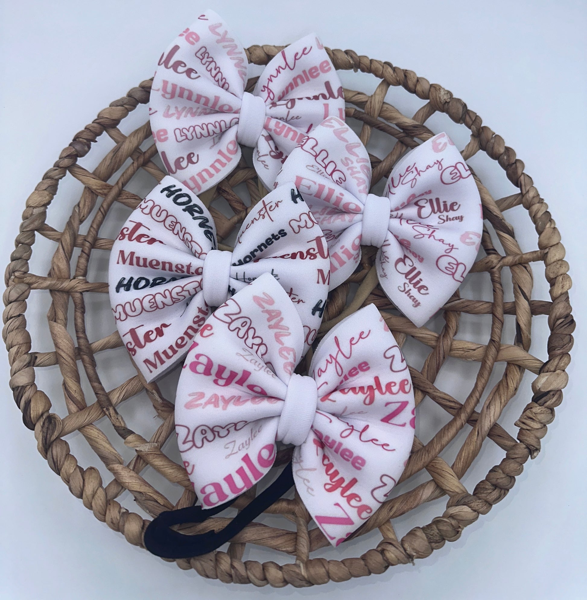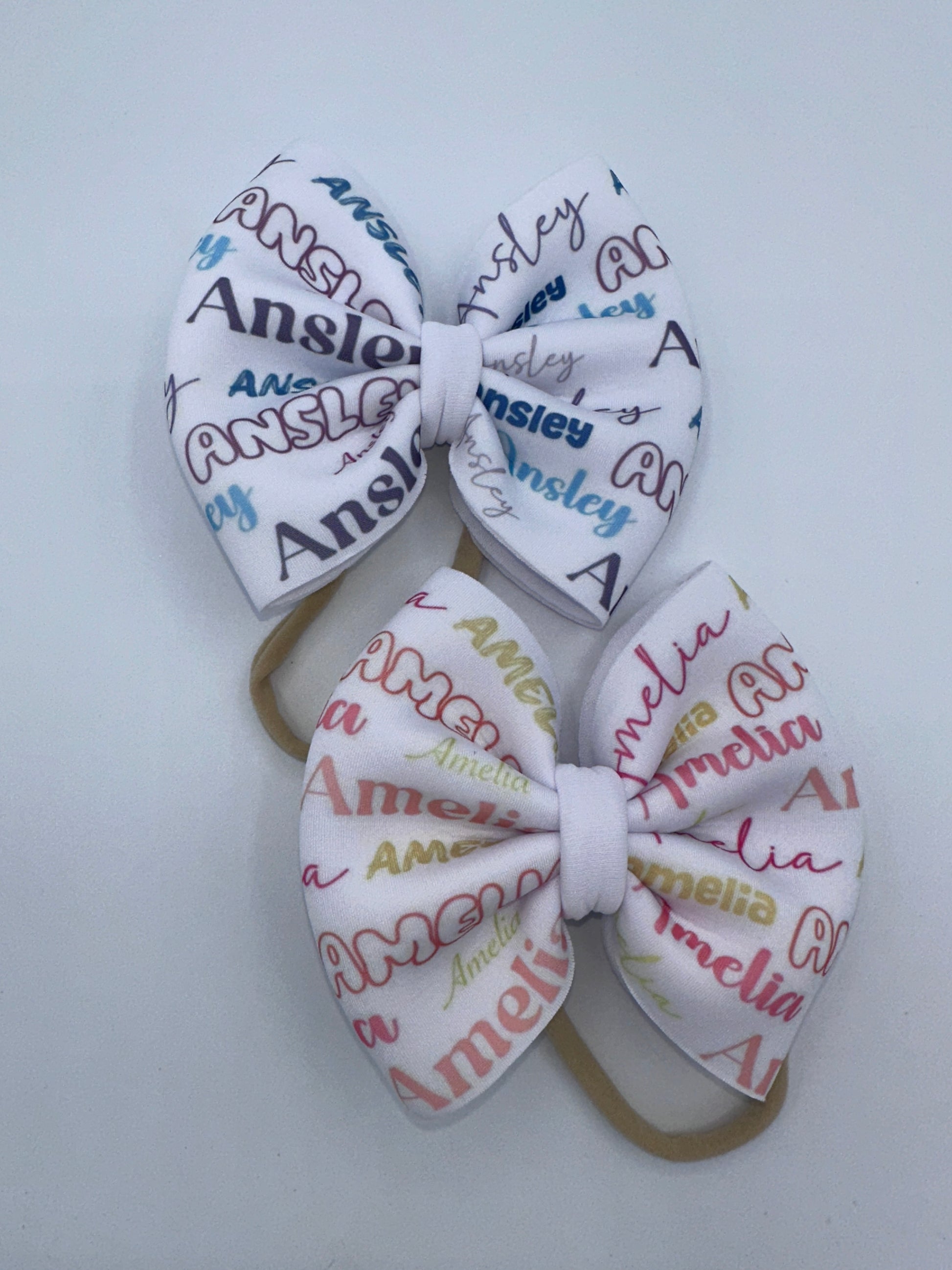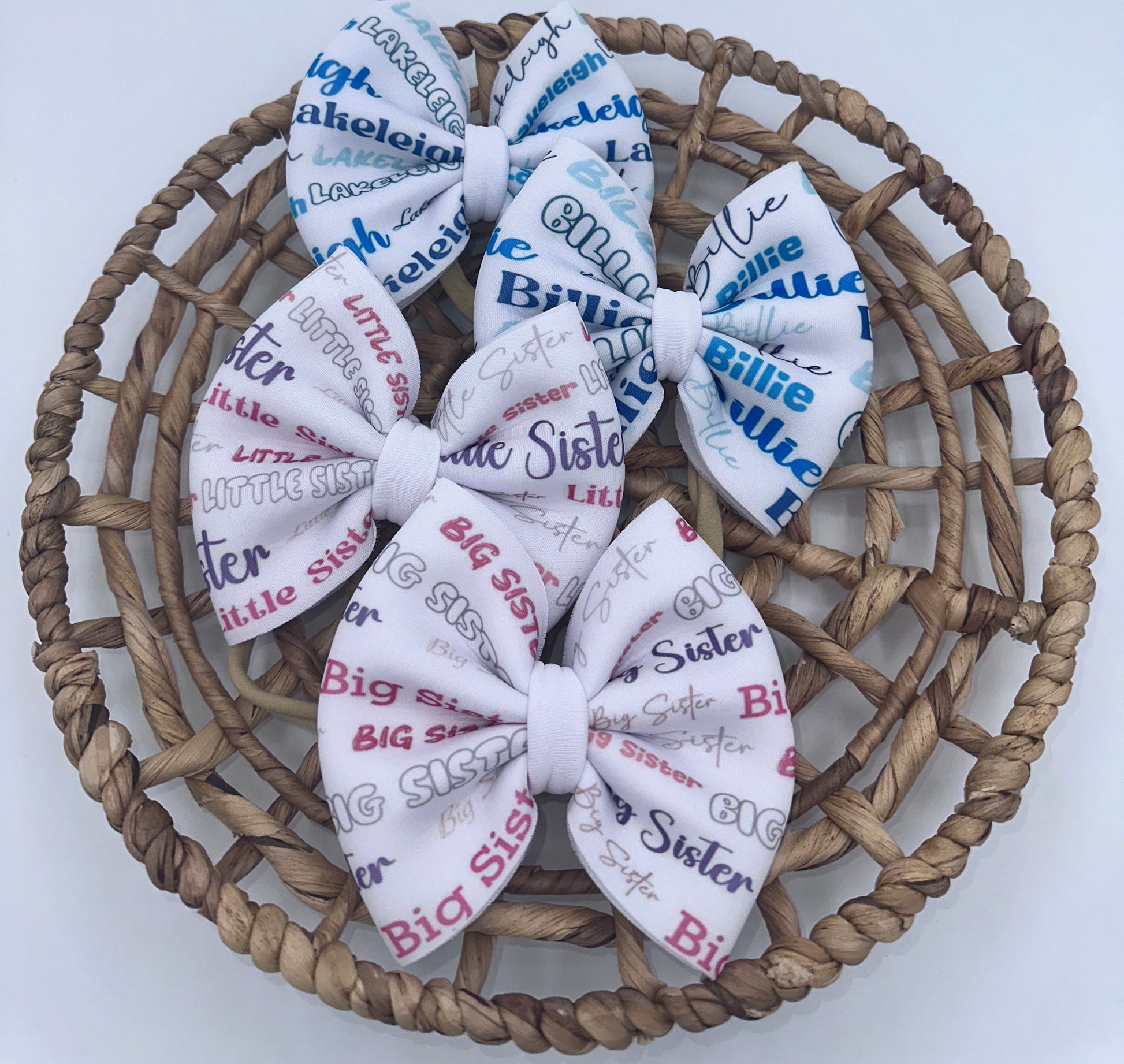 These bows are approximately 5 inches wide. You have the choice of the bow being on a 2.25 inch alligator clip or a stretchy nylon band . The nylon band is a one size fits all.