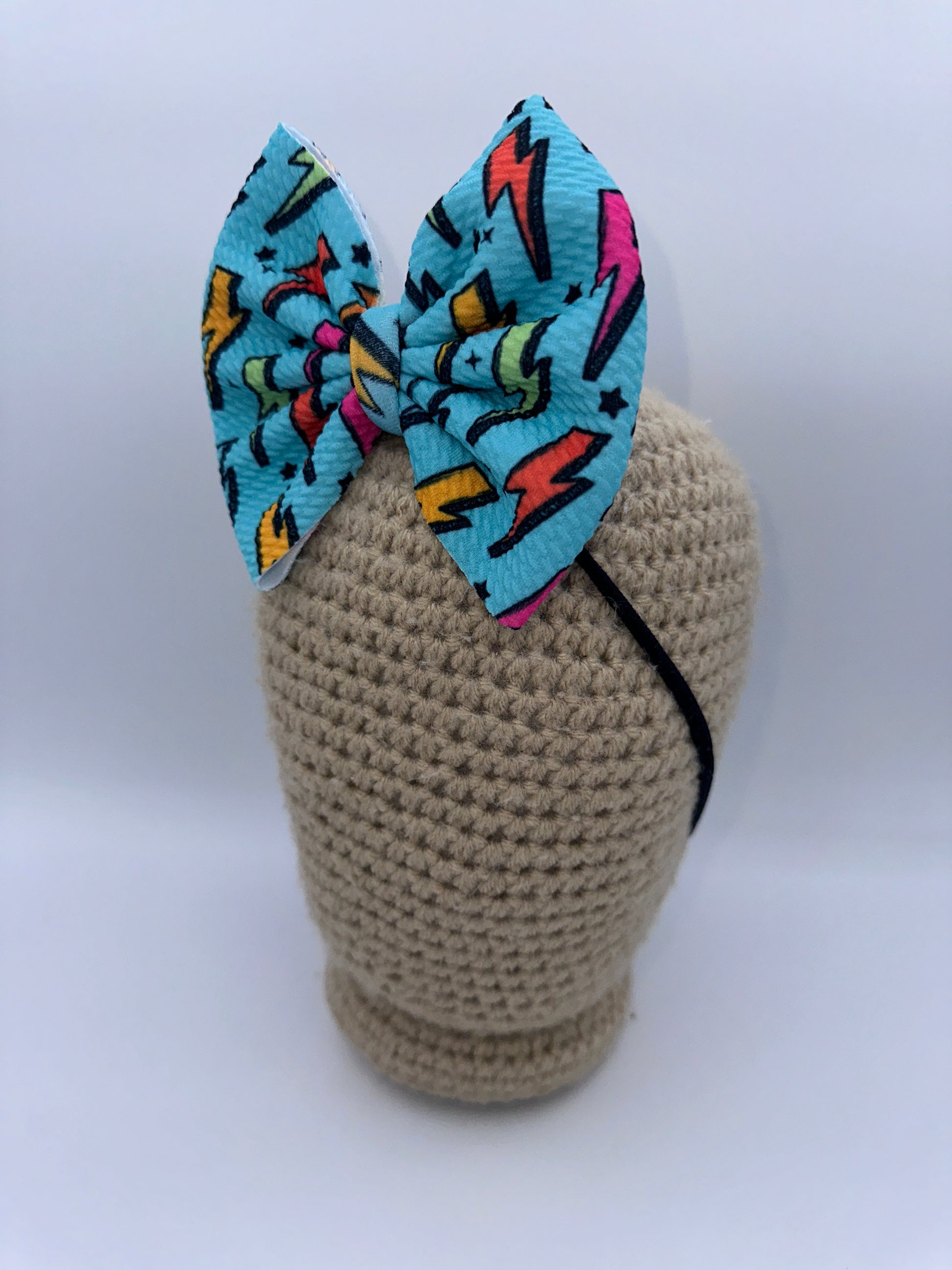 These bows are approximately 5 inches wide. You have the choice of the bow being on a 2.25 inch alligator clip or a stretchy nylon band . The nylon band is a one size fits all.