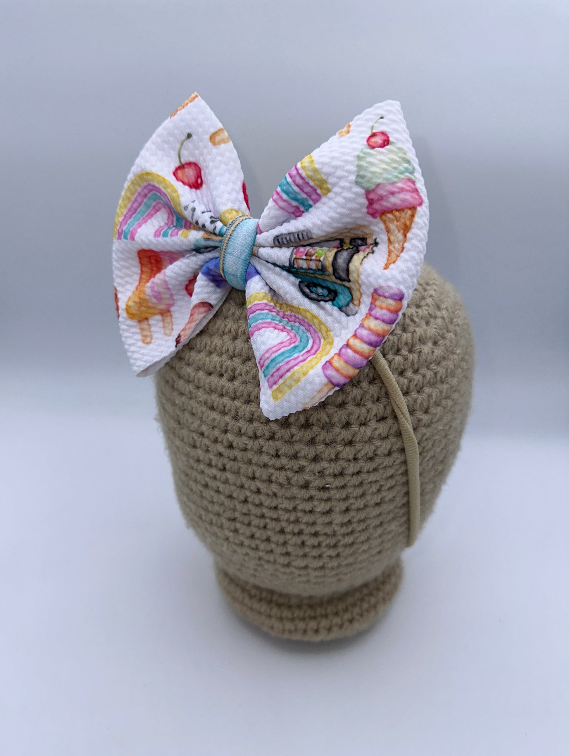 These bows are approximately 5 inches wide. You have the choice of the bow being on a 2.25 inch alligator clip or a stretchy nylon band . The nylon band is a one size fits all.