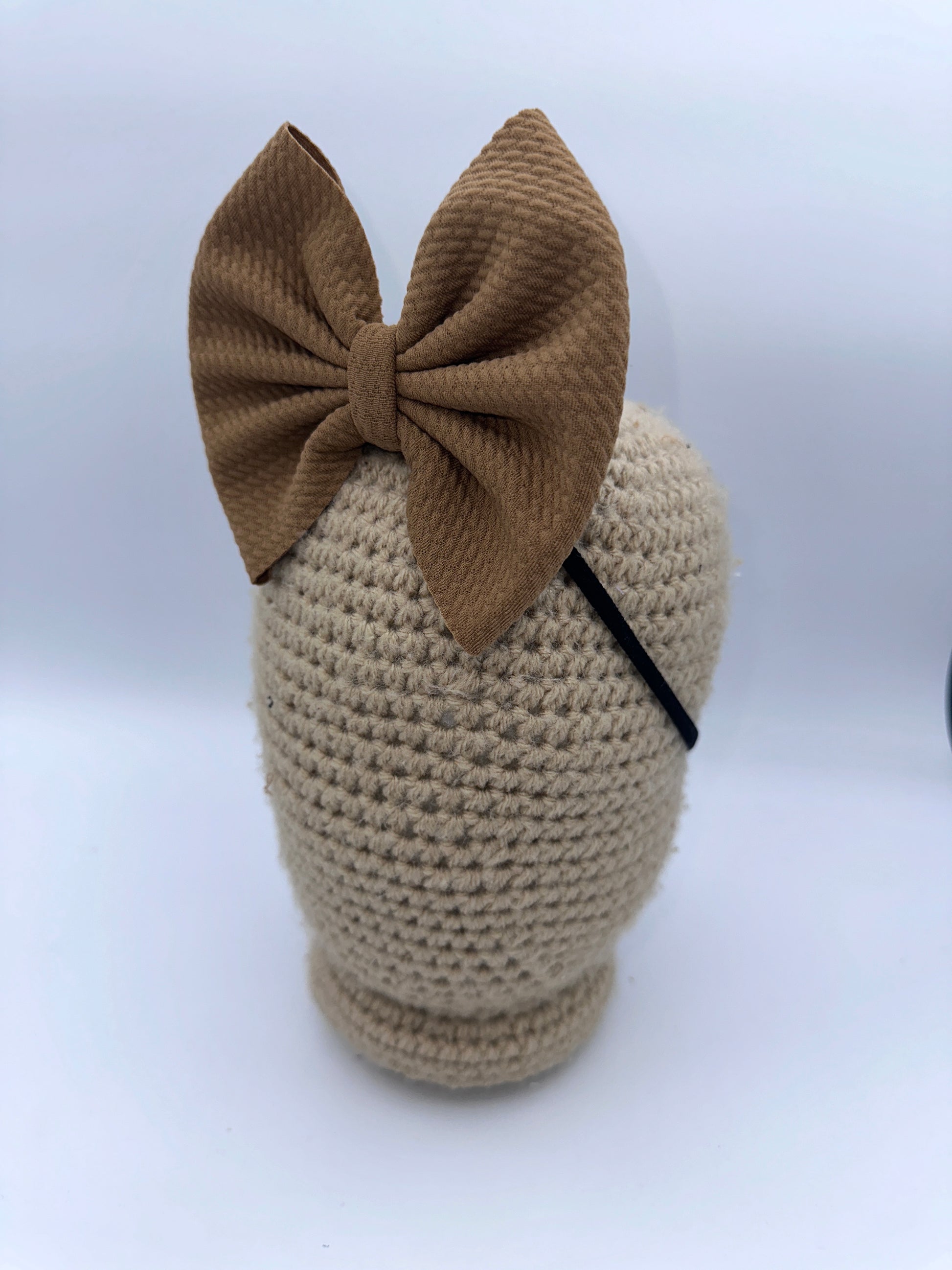 These bows are approximately 5 inches wide. You have the choice of the bow being on a 2.25 inch alligator clip or a stretchy nylon band . The nylon band is a one size fits all.
