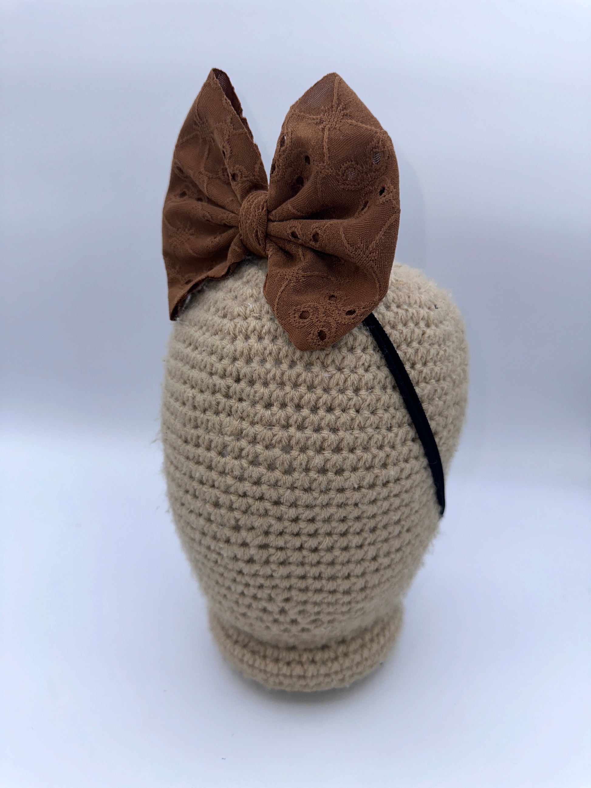 These bows are approximately 5 inches wide. You have the choice of the bow being on a 2.25 inch alligator clip or a stretchy nylon band . The nylon band is a one size fits all.