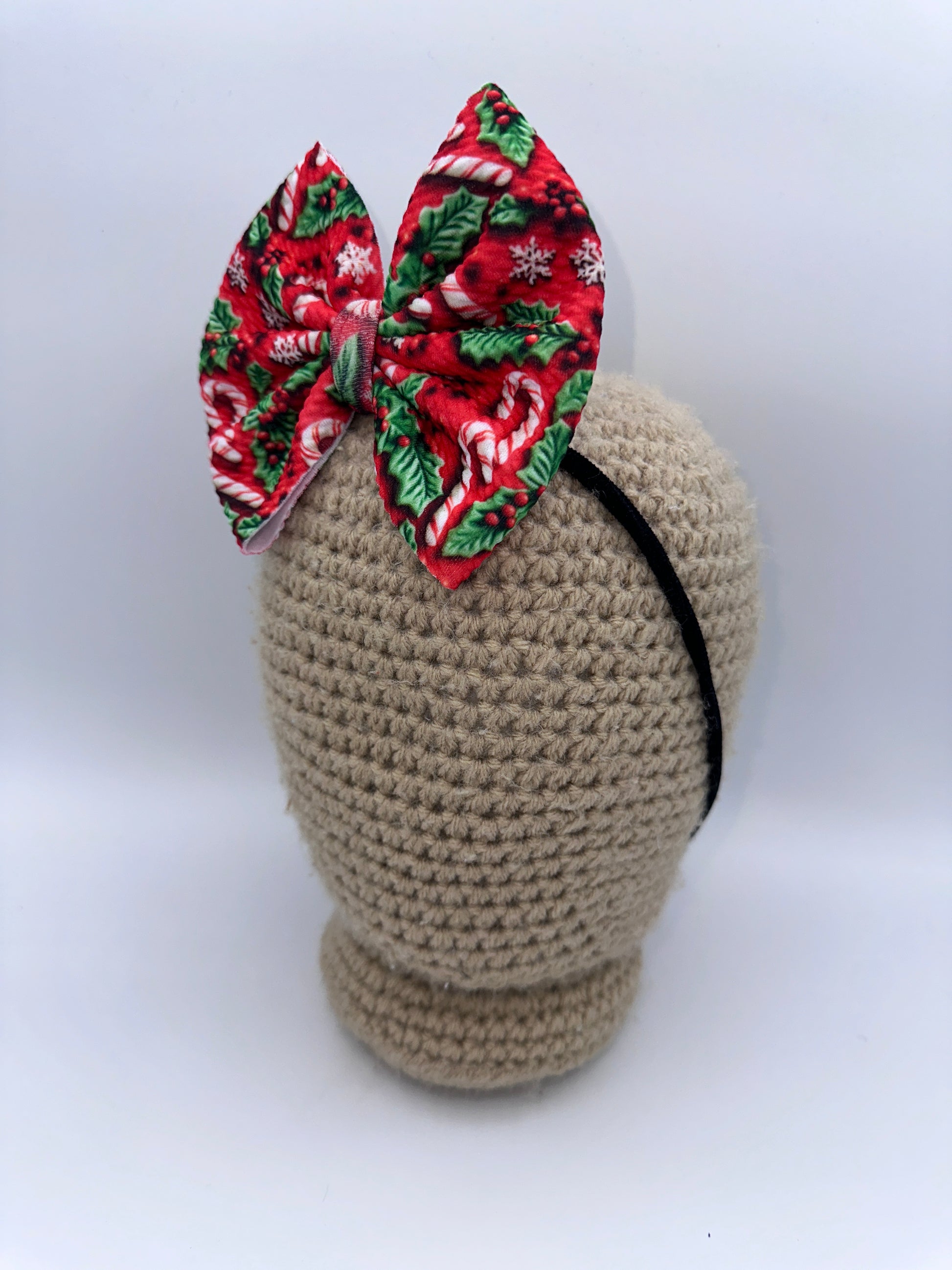 These bows are approximately 5 inches wide. You have the choice of the bow being on a 2.25 inch alligator clip or a stretchy nylon band . The nylon band is a one size fits all.