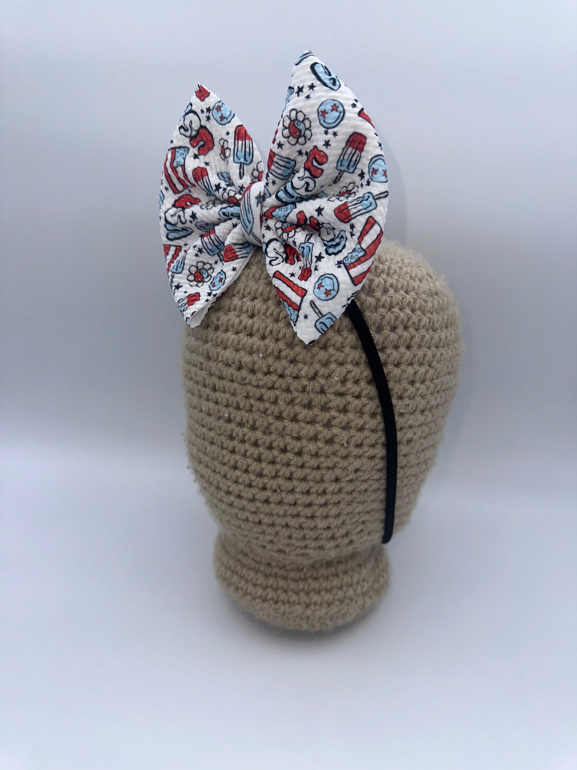 These bows are approximately 5 inches wide. You have the choice of the bow being on a 2.25 inch alligator clip or a stretchy nylon band . The nylon band is a one size fits all.