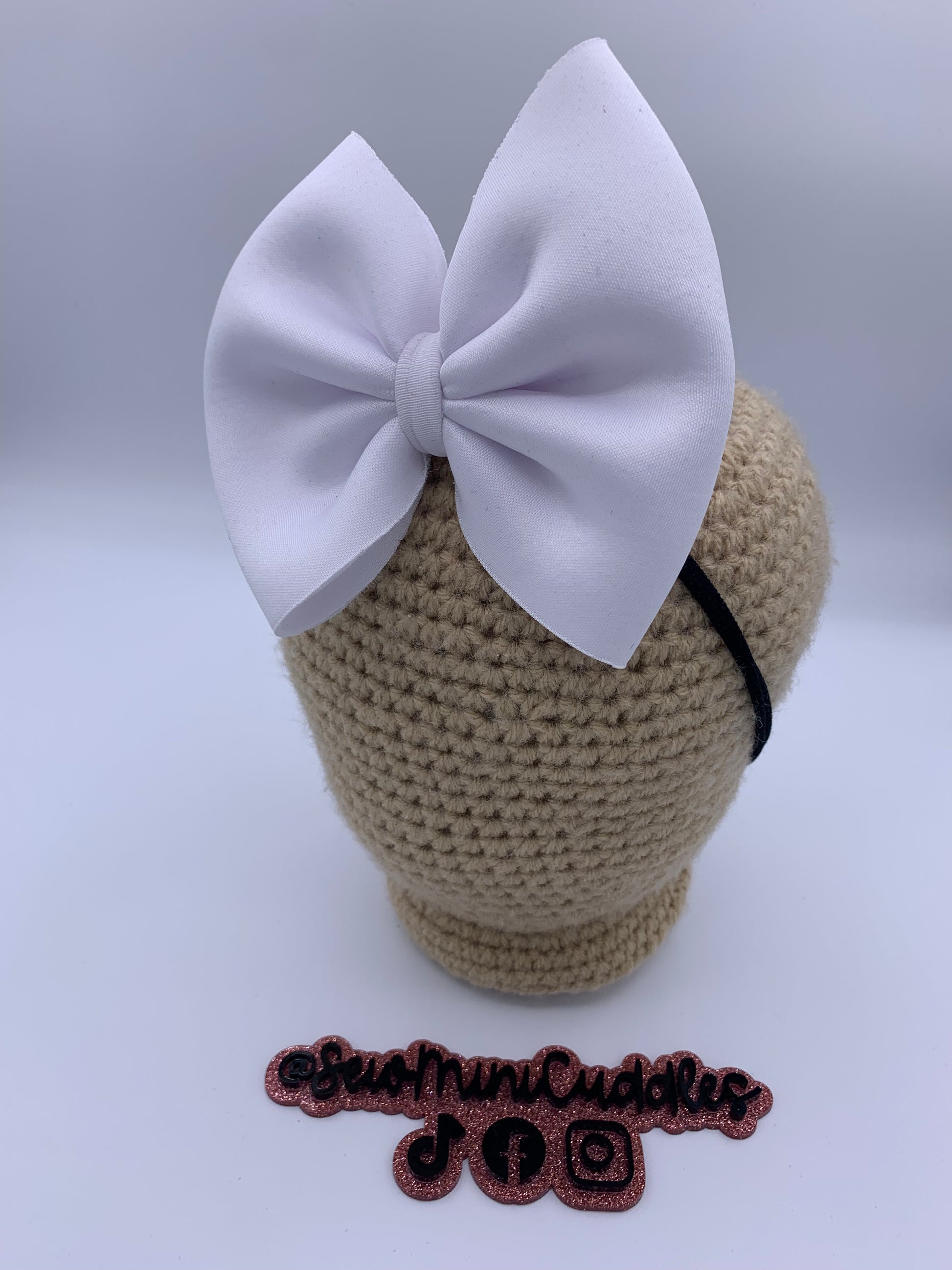 These bows are approximately 5 inches wide. You have the choice of the bow being on a 2.25 inch alligator clip or a stretchy nylon band . The nylon band is a one size fits all.