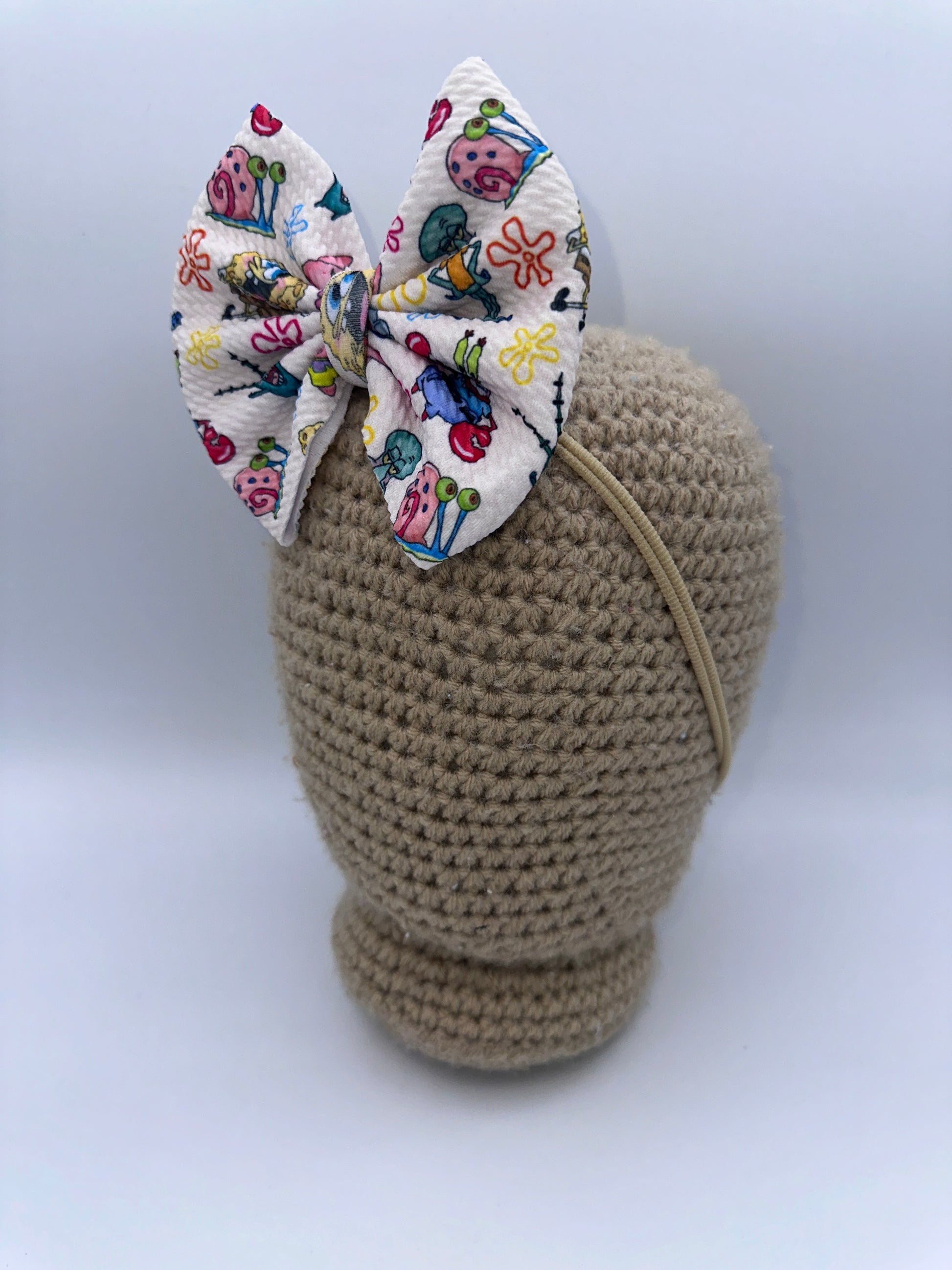 These bows are approximately 5 inches wide. You have the choice of the bow being on a 2.25 inch alligator clip or a stretchy nylon band . The nylon band is a one size fits all.