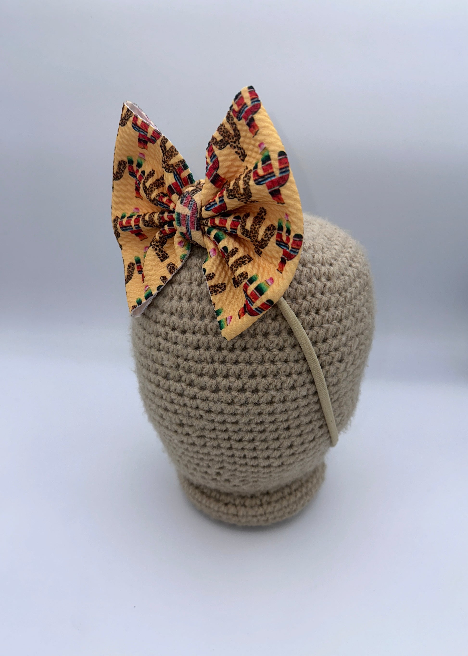 These bows are approximately 5 inches wide. You have the choice of the bow being on a 2.25 inch alligator clip or a stretchy nylon band . The nylon band is a one size fits all.
